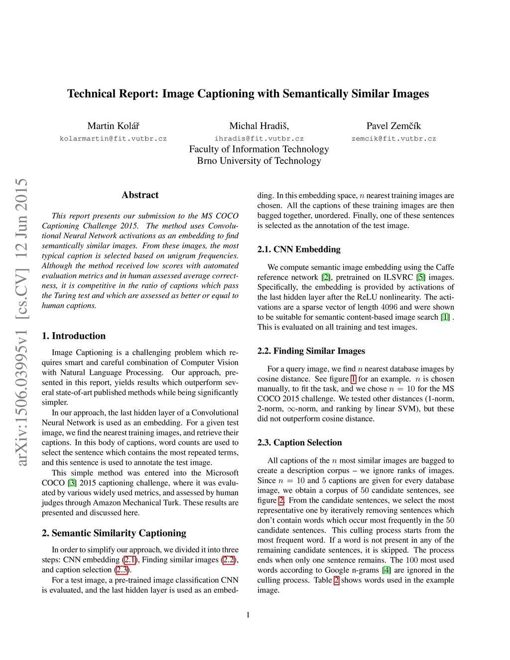 This report presents our submission to the MS COCO Captioning Challenge 2015. The method uses Convolutional Neural Network activations as an embedding to find semantically similar images. From these images, the most typical caption is selected based on unigram frequencies. Although the method received low scores with automated evaluation metrics and in human assessed average correctness, it is competitive in the ratio of captions which pass the Turing test and which are assessed as better or equal to human captions.