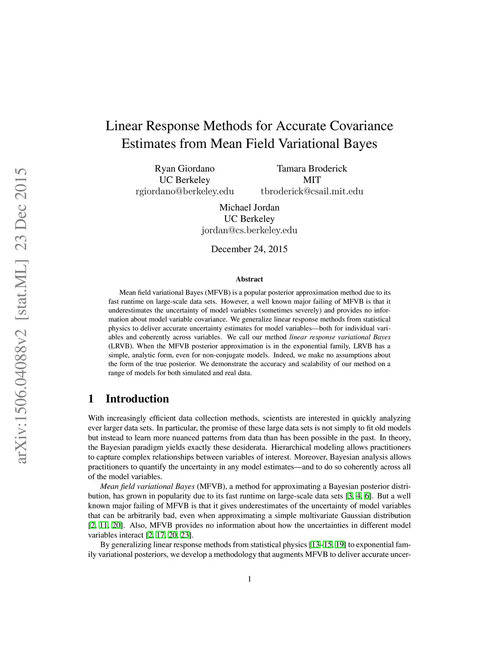 Mean field variational Bayes (MFVB) is a popular posterior approximation method due to its fast runtime on large-scale data sets. However, it is well known that a major failing of MFVB is that it underestimates the uncertainty of model variables (sometimes severely) and provides no information about model variable covariance. We generalize linear response methods from statistical physics to deliver accurate uncertainty estimates for model variables---both for individual variables and coherently across variables. We call our method linear response variational Bayes (LRVB). When the MFVB posterior approximation is in the exponential family, LRVB has a simple, analytic form, even for non-conjugate models. Indeed, we make no assumptions about the form of the true posterior. We demonstrate the accuracy and scalability of our method on a range of models for both simulated and real data.