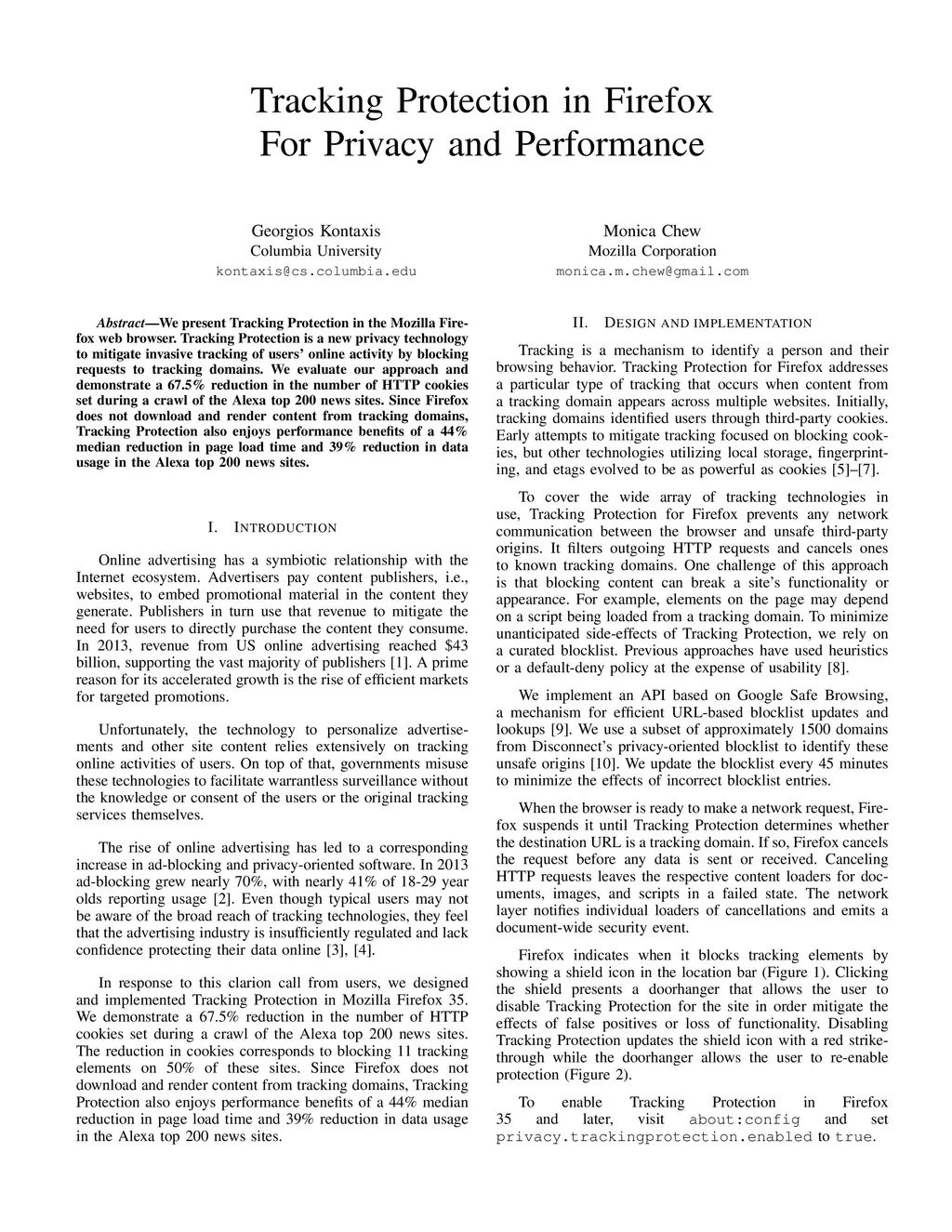 We present Tracking Protection in the Mozilla Firefox web browser. Tracking Protection is a new privacy technology to mitigate invasive tracking of users' online activity by blocking requests to tracking domains. We evaluate our approach and demonstrate a 67.5% reduction in the number of HTTP cookies set during a crawl of the Alexa top 200 news sites. Since Firefox does not download and render content from tracking domains, Tracking Protection also enjoys performance benefits of a 44% median reduction in page load time and 39% reduction in data usage in the Alexa top 200 news sites.