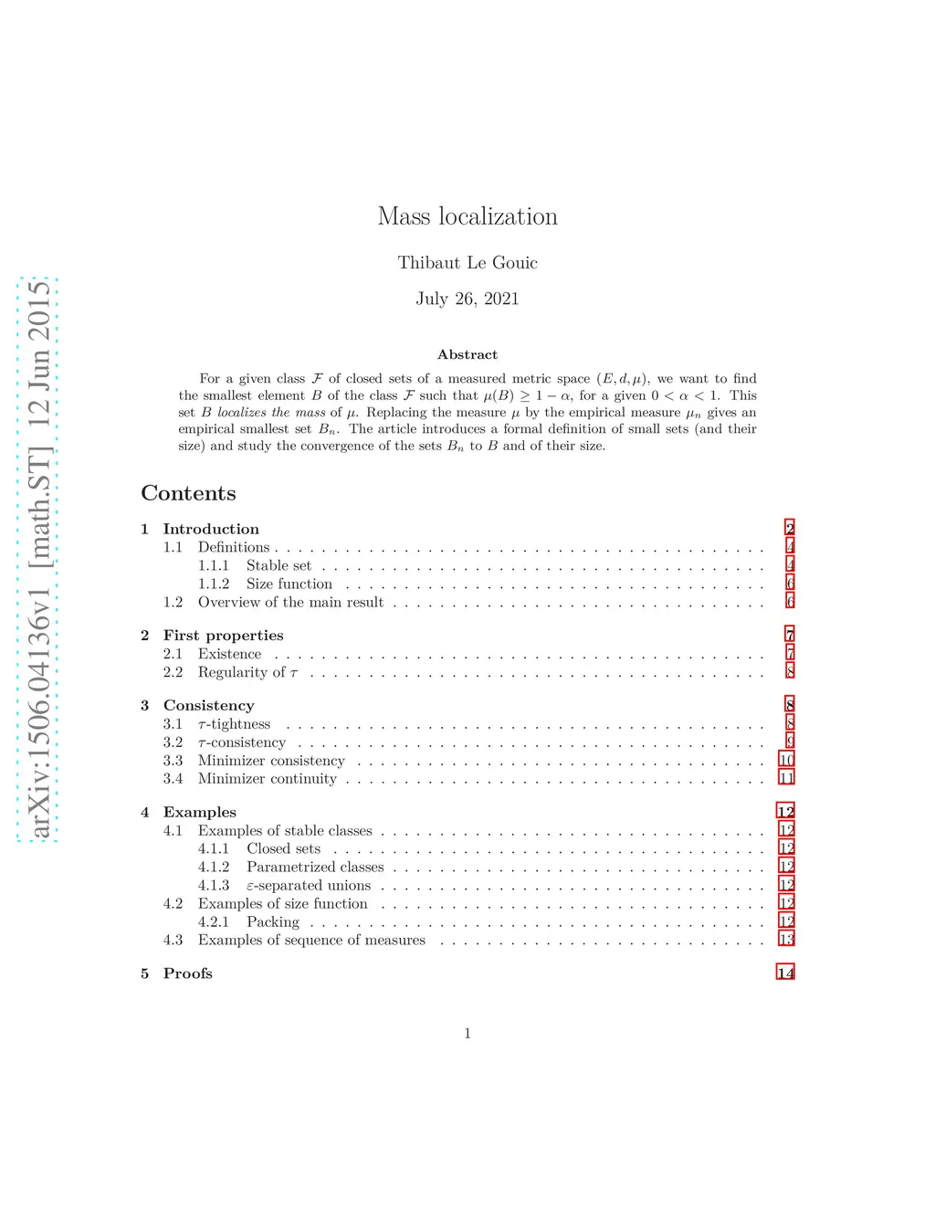 For a given class of closed sets of a measured metric space , we want to find the smallest element of the class such that , for a given . This set \textit{localizes the mass} of . Replacing the measure by the empirical measure gives an empirical smallest set . The article introduces a formal definition of small sets (and their size) and study the convergence of the sets to and of their size.