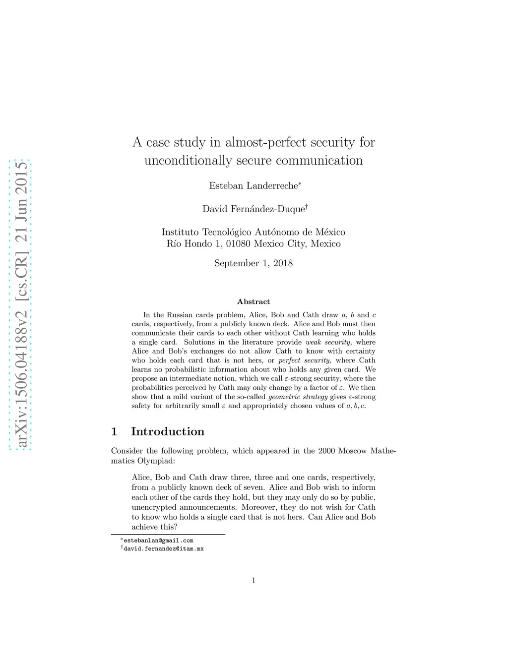 In the Russian cards problem, Alice, Bob and Cath draw , and cards, respectively, from a publicly known deck. Alice and Bob must then communicate their cards to each other without Cath learning who holds a single card. Solutions in the literature provide weak security, where Cath does not know with certainty who holds each card that is not hers, or perfect security, where Cath learns no probabilistic information about who holds any given card from Alice and Bob's exchange. We propose an intermediate notion, which we call -strong security, where the probabilities perceived by Cath may only change by a factor of . We then show that a mild variant of the so-called geometric strategy gives -strong safety for arbitrarily small and appropriately chosen values of .