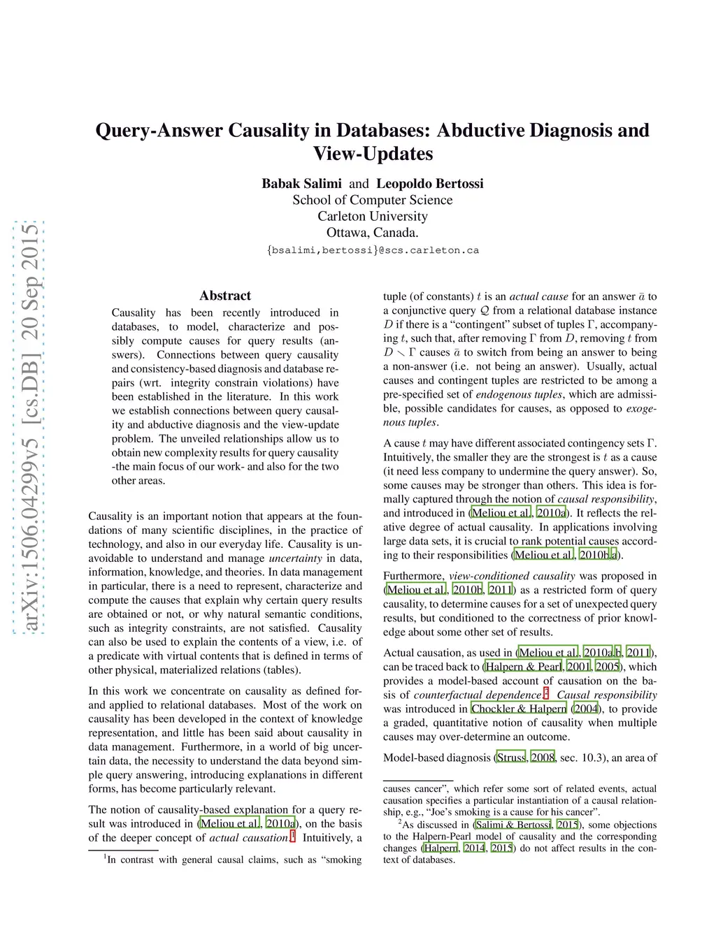Causality has been recently introduced in databases, to model, characterize and possibly compute causes for query results (answers). Connections between query causality and consistency-based diagnosis and database repairs (wrt. integrity constrain violations) have been established in the literature. In this work we establish connections between query causality and abductive diagnosis and the view-update problem. The unveiled relationships allow us to obtain new complexity results for query causality -the main focus of our work- and also for the two other areas.