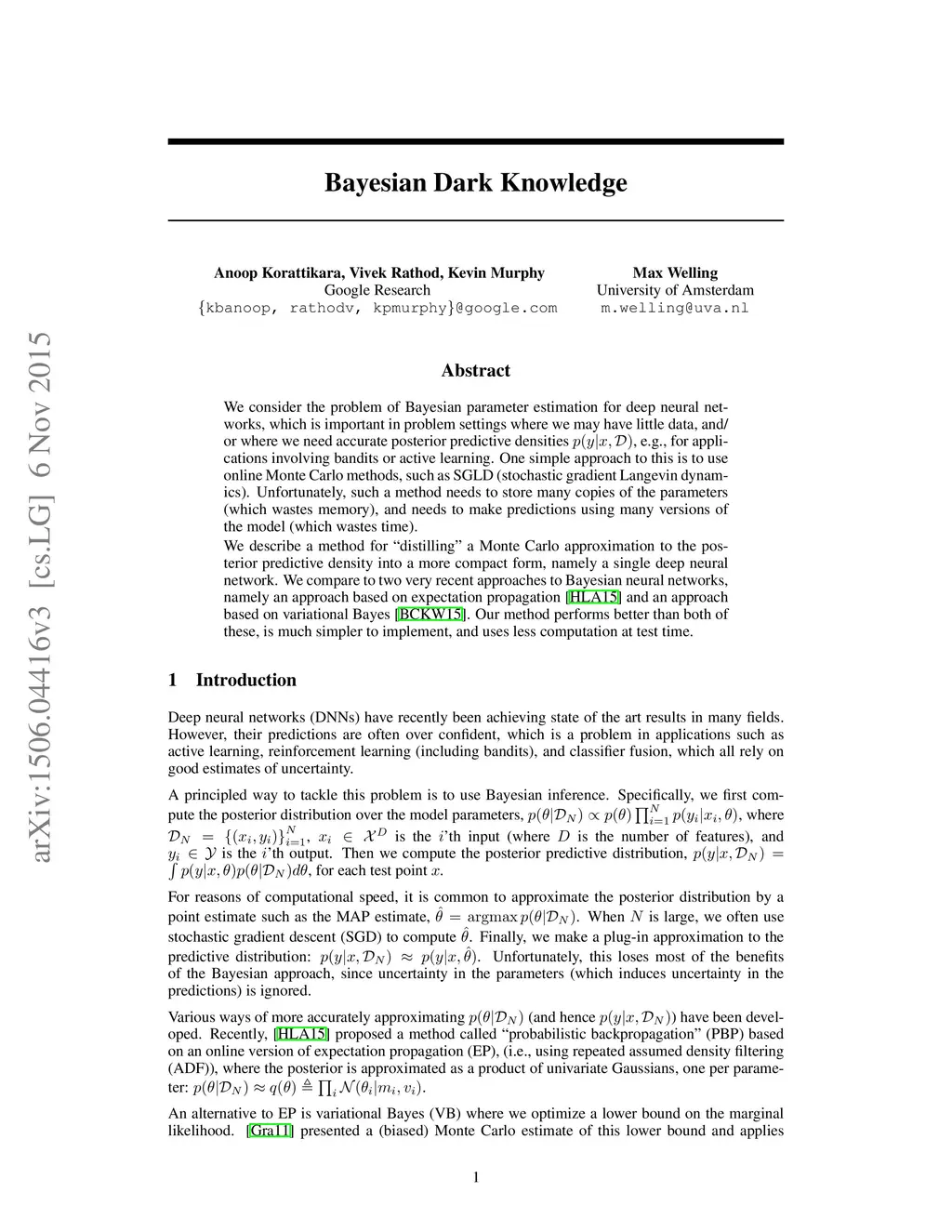 We consider the problem of Bayesian parameter estimation for deep neural networks, which is important in problem settings where we may have little data, and/ or where we need accurate posterior predictive densities, e.g., for applications involving bandits or active learning. One simple approach to this is to use online Monte Carlo methods, such as SGLD (stochastic gradient Langevin dynamics). Unfortunately, such a method needs to store many copies of the parameters (which wastes memory), and needs to make predictions using many versions of the model (which wastes time). We describe a method for "distilling" a Monte Carlo approximation to the posterior predictive density into a more compact form, namely a single deep neural network. We compare to two very recent approaches to Bayesian neural networks, namely an approach based on expectation propagation [Hernandez-Lobato and Adams, 2015] and an approach based on variational Bayes [Blundell et al., 2015]. Our method performs better than both of these, is much simpler to implement, and uses less computation at test time.