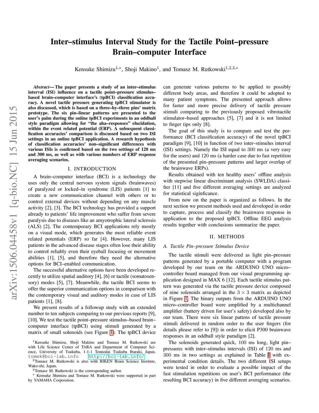 The paper presents a study of an inter-stimulus interval (ISI) influence on a tactile point-pressure stimulus-based brain-computer interface's (tpBCI) classification accuracy. A novel tactile pressure generating tpBCI stimulator is also discussed, which is based on a three-by-three pins' matrix prototype. The six pin-linear patterns are presented to the user's palm during the online tpBCI experiments in an oddball style paradigm allowing for "the aha-responses" elucidation, within the event related potential (ERP). A subsequent classification accuracies' comparison is discussed based on two ISI settings in an online tpBCI application. A research hypothesis of classification accuracies' non-significant differences with various ISIs is confirmed based on the two settings of 120 ms and 300 ms, as well as with various numbers of ERP response averaging scenarios.