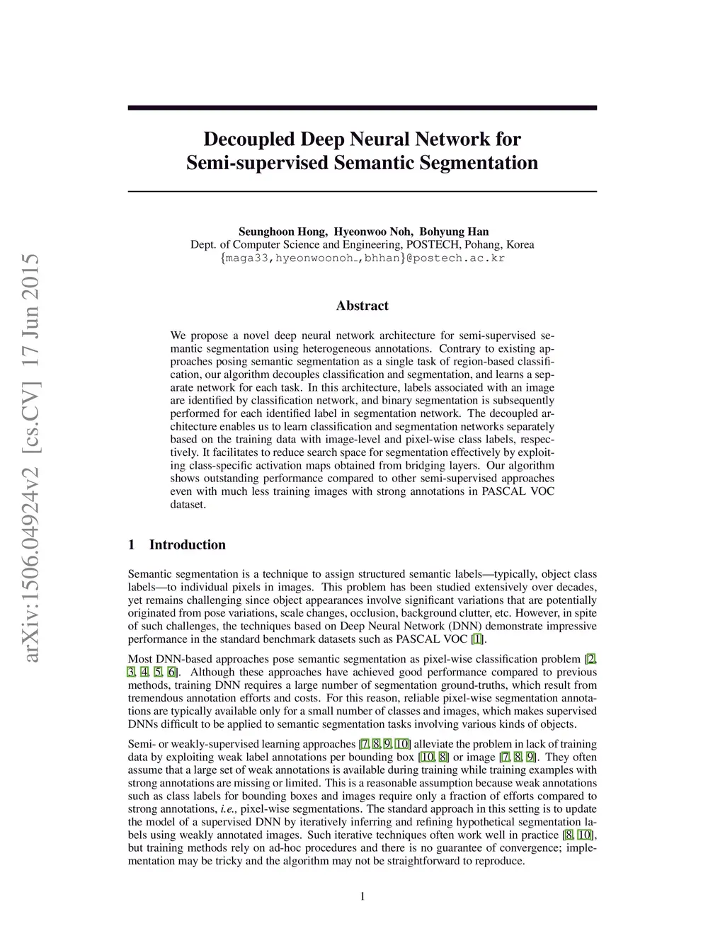 We propose a novel deep neural network architecture for semi-supervised semantic segmentation using heterogeneous annotations. Contrary to existing approaches posing semantic segmentation as a single task of region-based classification, our algorithm decouples classification and segmentation, and learns a separate network for each task. In this architecture, labels associated with an image are identified by classification network, and binary segmentation is subsequently performed for each identified label in segmentation network. The decoupled architecture enables us to learn classification and segmentation networks separately based on the training data with image-level and pixel-wise class labels, respectively. It facilitates to reduce search space for segmentation effectively by exploiting class-specific activation maps obtained from bridging layers. Our algorithm shows outstanding performance compared to other semi-supervised approaches even with much less training images with strong annotations in PASCAL VOC dataset.