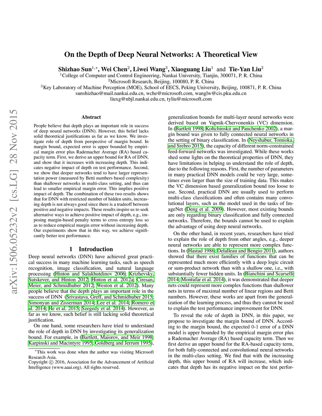 People believe that depth plays an important role in success of deep neural networks (DNN). However, this belief lacks solid theoretical justifications as far as we know. We investigate role of depth from perspective of margin bound. In margin bound, expected error is upper bounded by empirical margin error plus Rademacher Average (RA) based capacity term. First, we derive an upper bound for RA of DNN, and show that it increases with increasing depth. This indicates negative impact of depth on test performance. Second, we show that deeper networks tend to have larger representation power (measured by Betti numbers based complexity) than shallower networks in multi-class setting, and thus can lead to smaller empirical margin error. This implies positive impact of depth. The combination of these two results shows that for DNN with restricted number of hidden units, increasing depth is not always good since there is a tradeoff between positive and negative impacts. These results inspire us to seek alternative ways to achieve positive impact of depth, e.g., imposing margin-based penalty terms to cross entropy loss so as to reduce empirical margin error without increasing depth. Our experiments show that in this way, we achieve significantly better test performance.