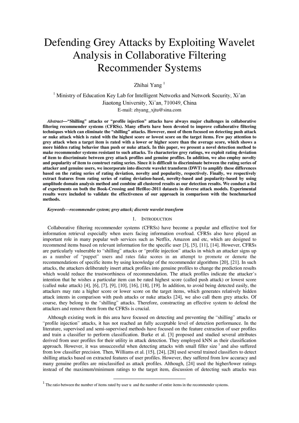 "Shilling" attacks or "profile injection" attacks have always major challenges in collaborative filtering recommender systems (CFRSs). Many efforts have been devoted to improve collaborative filtering techniques which can eliminate the "shilling" attacks. However, most of them focused on detecting push attack or nuke attack which is rated with the highest score or lowest score on the target items. Few pay attention to grey attack when a target item is rated with a lower or higher score than the average score, which shows a more hidden rating behavior than push or nuke attack. In this paper, we present a novel detection method to make recommender systems resistant to such attacks. To characterize grey ratings, we exploit rating deviation of item to discriminate between grey attack profiles and genuine profiles. In addition, we also employ novelty and popularity of item to construct rating series. Since it is difficult to discriminate between the rating series of attacker and genuine users, we incorporate into discrete wavelet transform (DWT) to amplify these differences based on the rating series of rating deviation, novelty and popularity, respectively. Finally, we respectively extract features from rating series of rating deviation-based, novelty-based and popularity-based by using amplitude domain analysis method and combine all clustered results as our detection results. We conduct a list of experiments on both the Book-Crossing and HetRec-2011 datasets in diverse attack models. Experimental results were included to validate the effectiveness of our approach in comparison with the benchmarked methods.