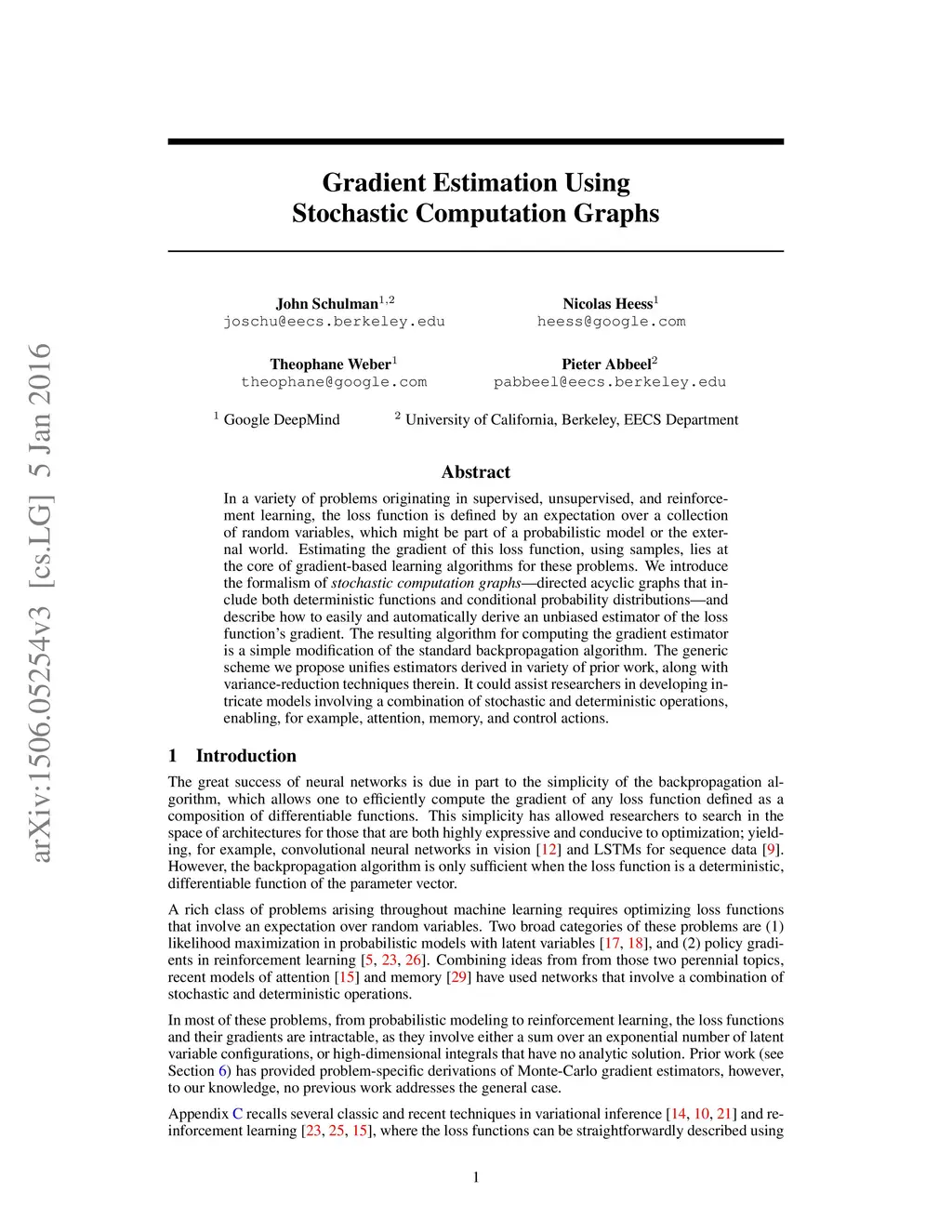 In a variety of problems originating in supervised, unsupervised, and reinforcement learning, the loss function is defined by an expectation over a collection of random variables, which might be part of a probabilistic model or the external world. Estimating the gradient of this loss function, using samples, lies at the core of gradient-based learning algorithms for these problems. We introduce the formalism of stochastic computation graphs---directed acyclic graphs that include both deterministic functions and conditional probability distributions---and describe how to easily and automatically derive an unbiased estimator of the loss function's gradient. The resulting algorithm for computing the gradient estimator is a simple modification of the standard backpropagation algorithm. The generic scheme we propose unifies estimators derived in variety of prior work, along with variance-reduction techniques therein. It could assist researchers in developing intricate models involving a combination of stochastic and deterministic operations, enabling, for example, attention, memory, and control actions.