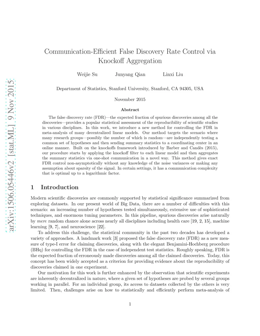 The false discovery rate (FDR)---the expected fraction of spurious discoveries among all the discoveries---provides a popular statistical assessment of the reproducibility of scientific studies in various disciplines. In this work, we introduce a new method for controlling the FDR in meta-analysis of many decentralized linear models. Our method targets the scenario where many research groups---possibly the number of which is random---are independently testing a common set of hypotheses and then sending summary statistics to a coordinating center in an online manner. Built on the knockoffs framework introduced by Barber and Candes (2015), our procedure starts by applying the knockoff filter to each linear model and then aggregates the summary statistics via one-shot communication in a novel way. This method gives exact FDR control non-asymptotically without any knowledge of the noise variances or making any assumption about sparsity of the signal. In certain settings, it has a communication complexity that is optimal up to a logarithmic factor.