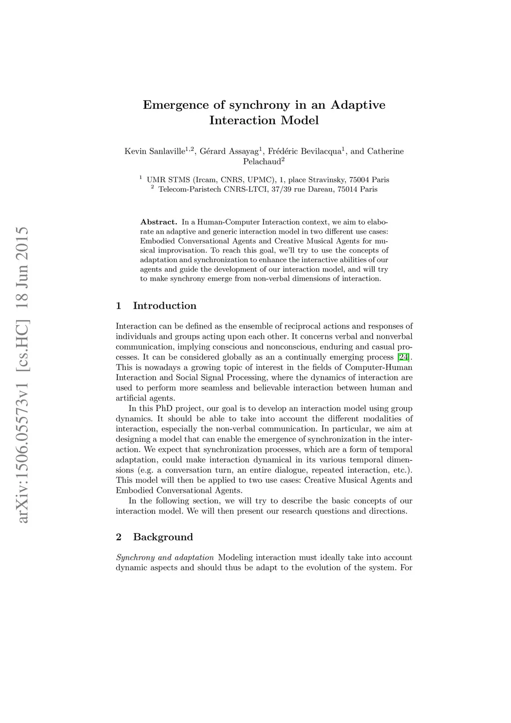 In a Human-Computer Interaction context, we aim to elaborate an adaptive and generic interaction model in two different use cases: Embodied Conversational Agents and Creative Musical Agents for musical improvisation. To reach this goal, we'll try to use the concepts of adaptation and synchronization to enhance the interactive abilities of our agents and guide the development of our interaction model, and will try to make synchrony emerge from non-verbal dimensions of interaction.