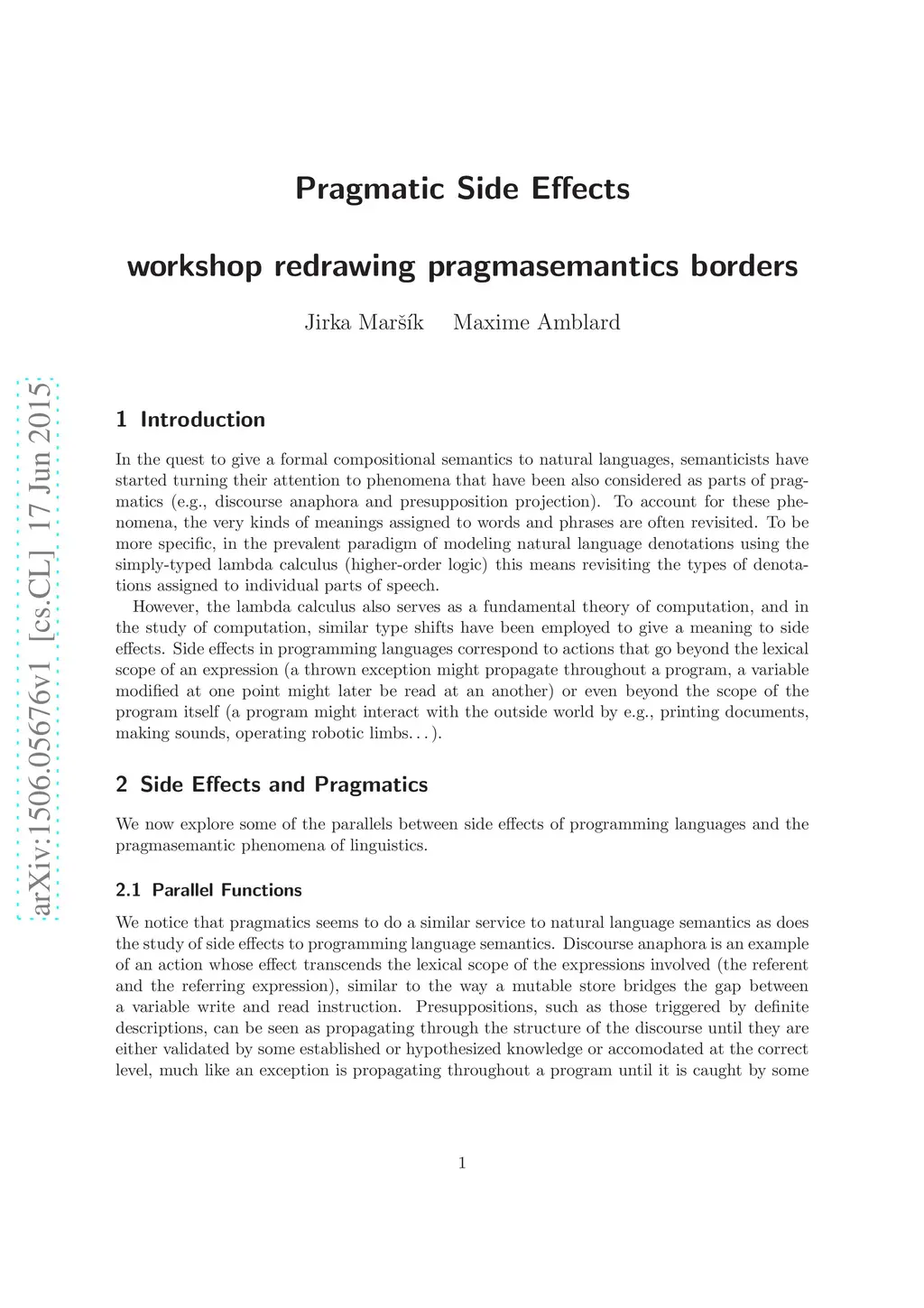 In the quest to give a formal compositional semantics to natural languages, semanticists have started turning their attention to phenomena that have been also considered as parts of pragmatics (e.g., discourse anaphora and presupposition projection). To account for these phenomena, the very kinds of meanings assigned to words and phrases are often revisited. To be more specific, in the prevalent paradigm of modeling natural language denotations using the simply-typed lambda calculus (higher-order logic) this means revisiting the types of denotations assigned to individual parts of speech. However, the lambda calculus also serves as a fundamental theory of computation, and in the study of computation, similar type shifts have been employed to give a meaning to side effects. Side effects in programming languages correspond to actions that go beyond the lexical scope of an expression (a thrown exception might propagate throughout a program, a variable modified at one point might later be read at an another) or even beyond the scope of the program itself (a program might interact with the outside world by e.g., printing documents, making sounds, operating robotic limbs...).