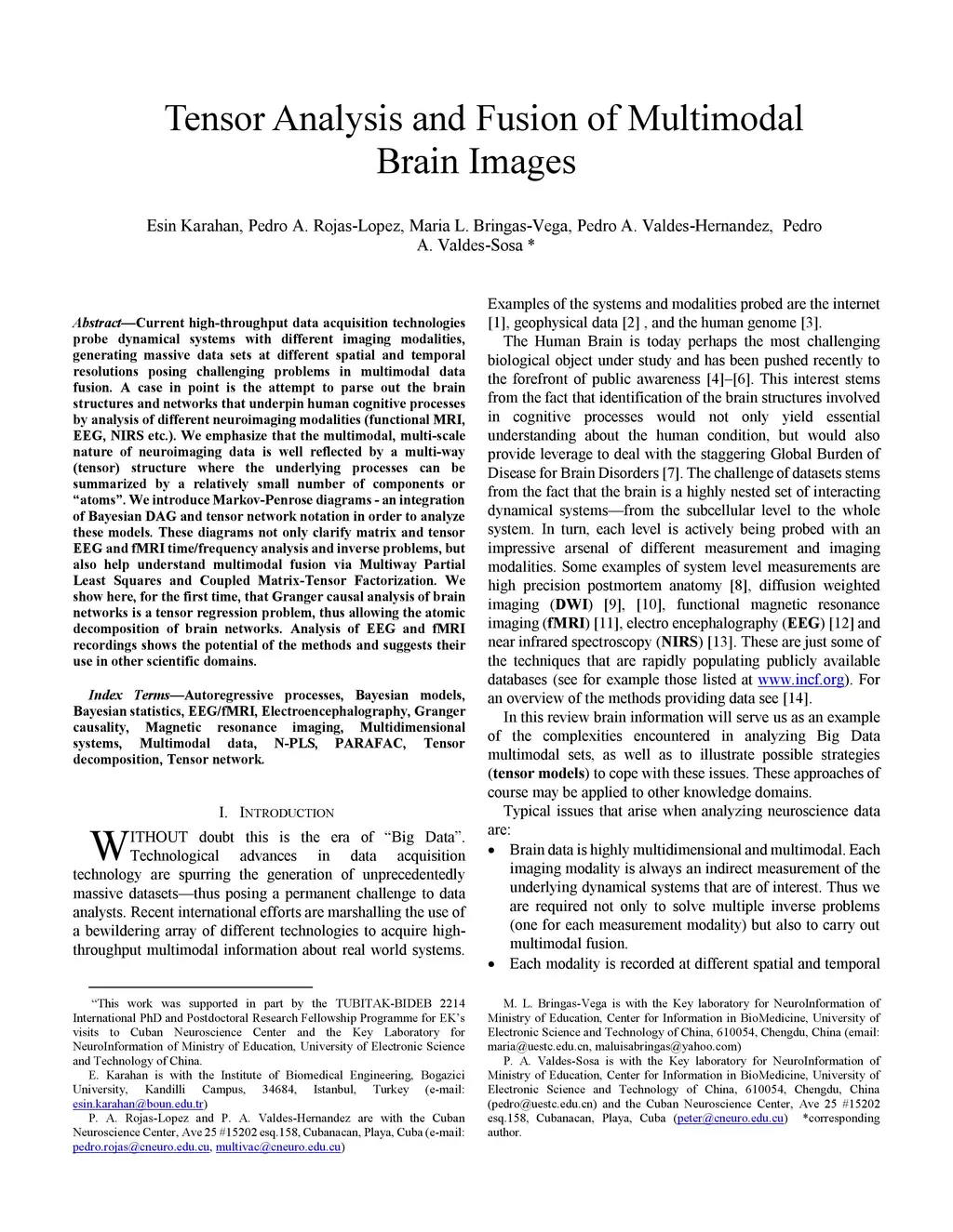 Current high-throughput data acquisition technologies probe dynamical systems with different imaging modalities, generating massive data sets at different spatial and temporal resolutions posing challenging problems in multimodal data fusion. A case in point is the attempt to parse out the brain structures and networks that underpin human cognitive processes by analysis of different neuroimaging modalities (functional MRI, EEG, NIRS etc.). We emphasize that the multimodal, multi-scale nature of neuroimaging data is well reflected by a multi-way (tensor) structure where the underlying processes can be summarized by a relatively small number of components or "atoms". We introduce Markov-Penrose diagrams - an integration of Bayesian DAG and tensor network notation in order to analyze these models. These diagrams not only clarify matrix and tensor EEG and fMRI time/frequency analysis and inverse problems, but also help understand multimodal fusion via Multiway Partial Least Squares and Coupled Matrix-Tensor Factorization. We show here, for the first time, that Granger causal analysis of brain networks is a tensor regression problem, thus allowing the atomic decomposition of brain networks. Analysis of EEG and fMRI recordings shows the potential of the methods and suggests their use in other scientific domains.