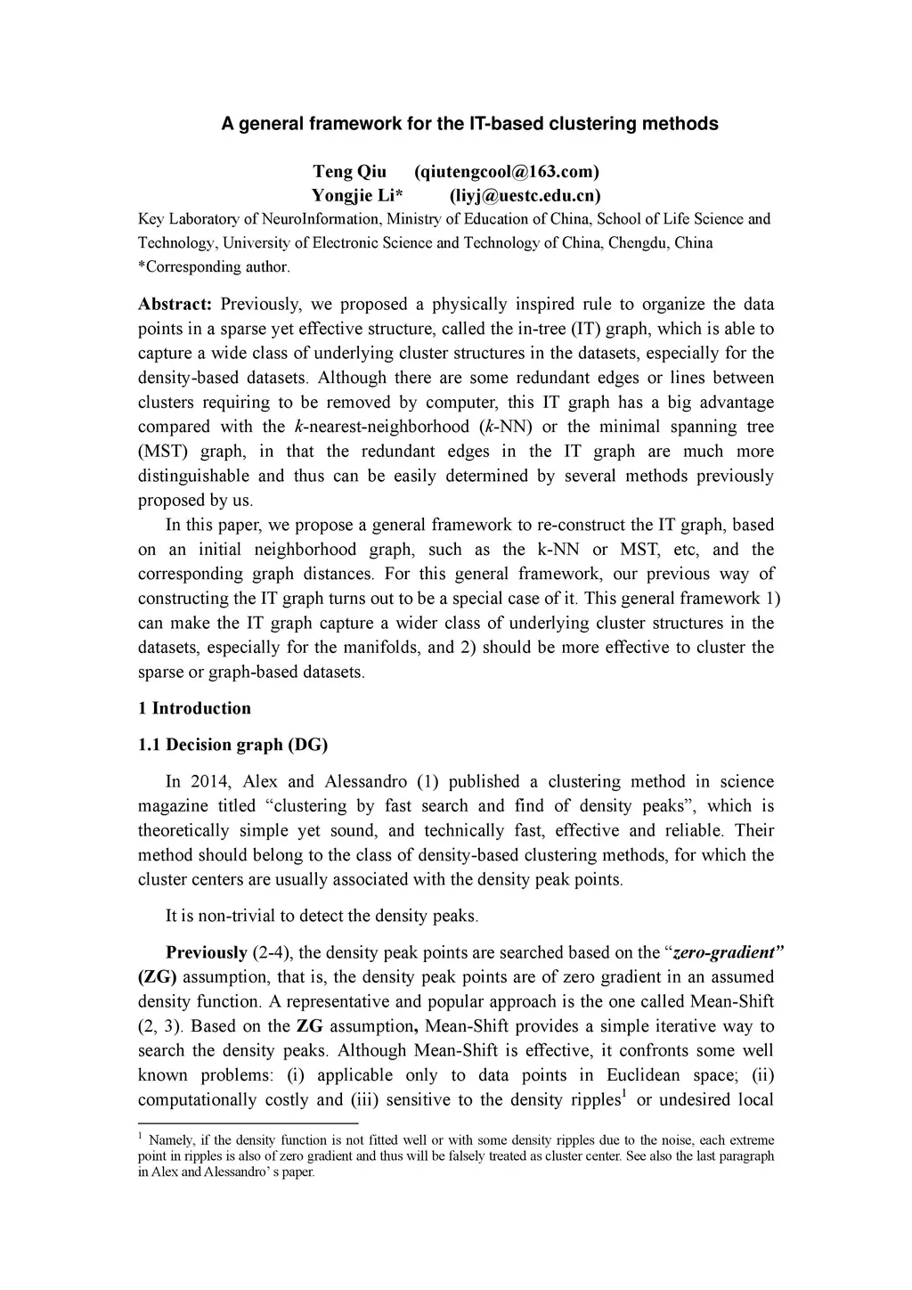 Previously, we proposed a physically inspired rule to organize the data points in a sparse yet effective structure, called the in-tree (IT) graph, which is able to capture a wide class of underlying cluster structures in the datasets, especially for the density-based datasets. Although there are some redundant edges or lines between clusters requiring to be removed by computer, this IT graph has a big advantage compared with the k-nearest-neighborhood (k-NN) or the minimal spanning tree (MST) graph, in that the redundant edges in the IT graph are much more distinguishable and thus can be easily determined by several methods previously proposed by us. In this paper, we propose a general framework to re-construct the IT graph, based on an initial neighborhood graph, such as the k-NN or MST, etc, and the corresponding graph distances. For this general framework, our previous way of constructing the IT graph turns out to be a special case of it. This general framework 1) can make the IT graph capture a wider class of underlying cluster structures in the datasets, especially for the manifolds, and 2) should be more effective to cluster the sparse or graph-based datasets.