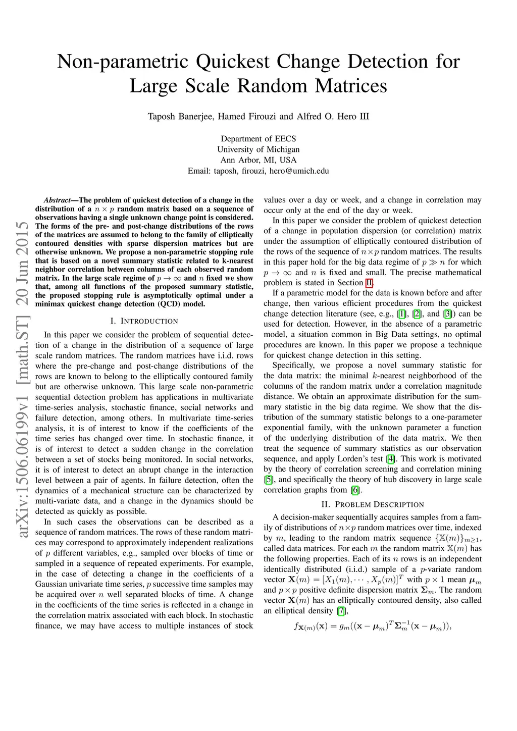 The problem of quickest detection of a change in the distribution of a random matrix based on a sequence of observations having a single unknown change point is considered. The forms of the pre- and post-change distributions of the rows of the matrices are assumed to belong to the family of elliptically contoured densities with sparse dispersion matrices but are otherwise unknown. We propose a non-parametric stopping rule that is based on a novel summary statistic related to k-nearest neighbor correlation between columns of each observed random matrix. In the large scale regime of and fixed we show that, among all functions of the proposed summary statistic, the proposed stopping rule is asymptotically optimal under a minimax quickest change detection (QCD) model.