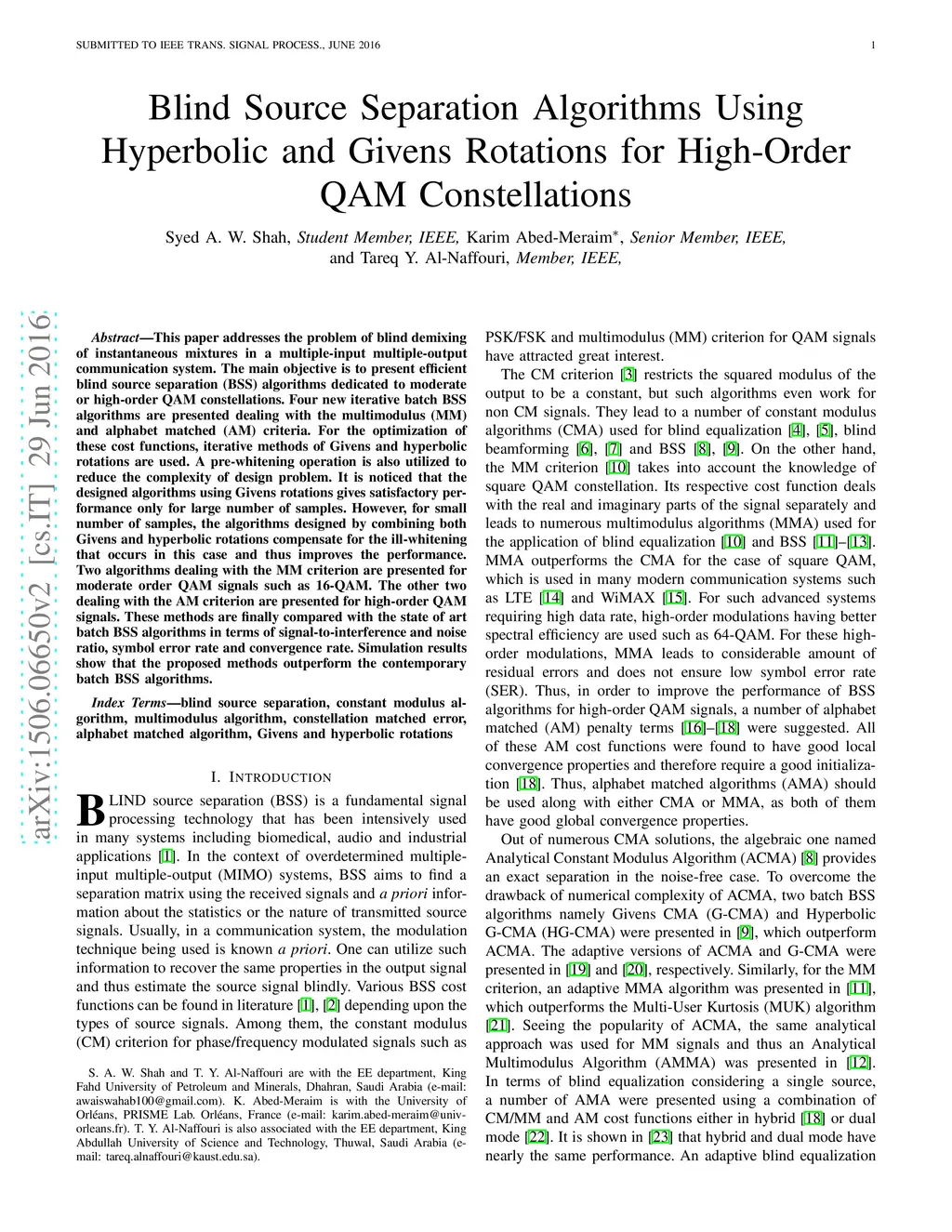 This paper addresses the problem of blind demixing of instantaneous mixtures in a multiple-input multiple-output communication system. The main objective is to present efficient blind source separation (BSS) algorithms dedicated to moderate or high-order QAM constellations. Four new iterative batch BSS algorithms are presented dealing with the multimodulus (MM) and alphabet matched (AM) criteria. For the optimization of these cost functions, iterative methods of Givens and hyperbolic rotations are used. A pre-whitening operation is also utilized to reduce the complexity of design problem. It is noticed that the designed algorithms using Givens rotations gives satisfactory performance only for large number of samples. However, for small number of samples, the algorithms designed by combining both Givens and hyperbolic rotations compensate for the ill-whitening that occurs in this case and thus improves the performance. Two algorithms dealing with the MM criterion are presented for moderate order QAM signals such as 16-QAM. The other two dealing with the AM criterion are presented for high-order QAM signals. These methods are finally compared with the state of art batch BSS algorithms in terms of signal-to-interference and noise ratio, symbol error rate and convergence rate. Simulation results show that the proposed methods outperform the contemporary batch BSS algorithms.