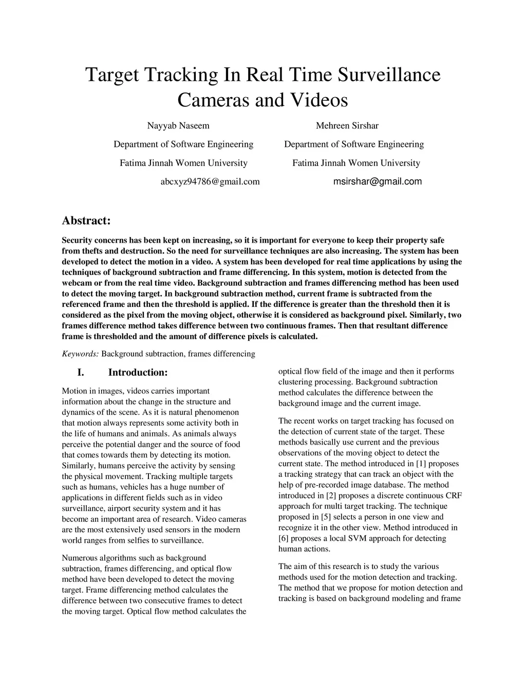 Security concerns has been kept on increasing, so it is important for everyone to keep their property safe from thefts and destruction. So the need for surveillance techniques are also increasing. The system has been developed to detect the motion in a video. A system has been developed for real time applications by using the techniques of background subtraction and frame differencing. In this system, motion is detected from the webcam or from the real time video. Background subtraction and frames differencing method has been used to detect the moving target. In background subtraction method, current frame is subtracted from the referenced frame and then the threshold is applied. If the difference is greater than the threshold then it is considered as the pixel from the moving object, otherwise it is considered as background pixel. Similarly, two frames difference method takes difference between two continuous frames. Then that resultant difference frame is thresholded and the amount of difference pixels is calculated.
