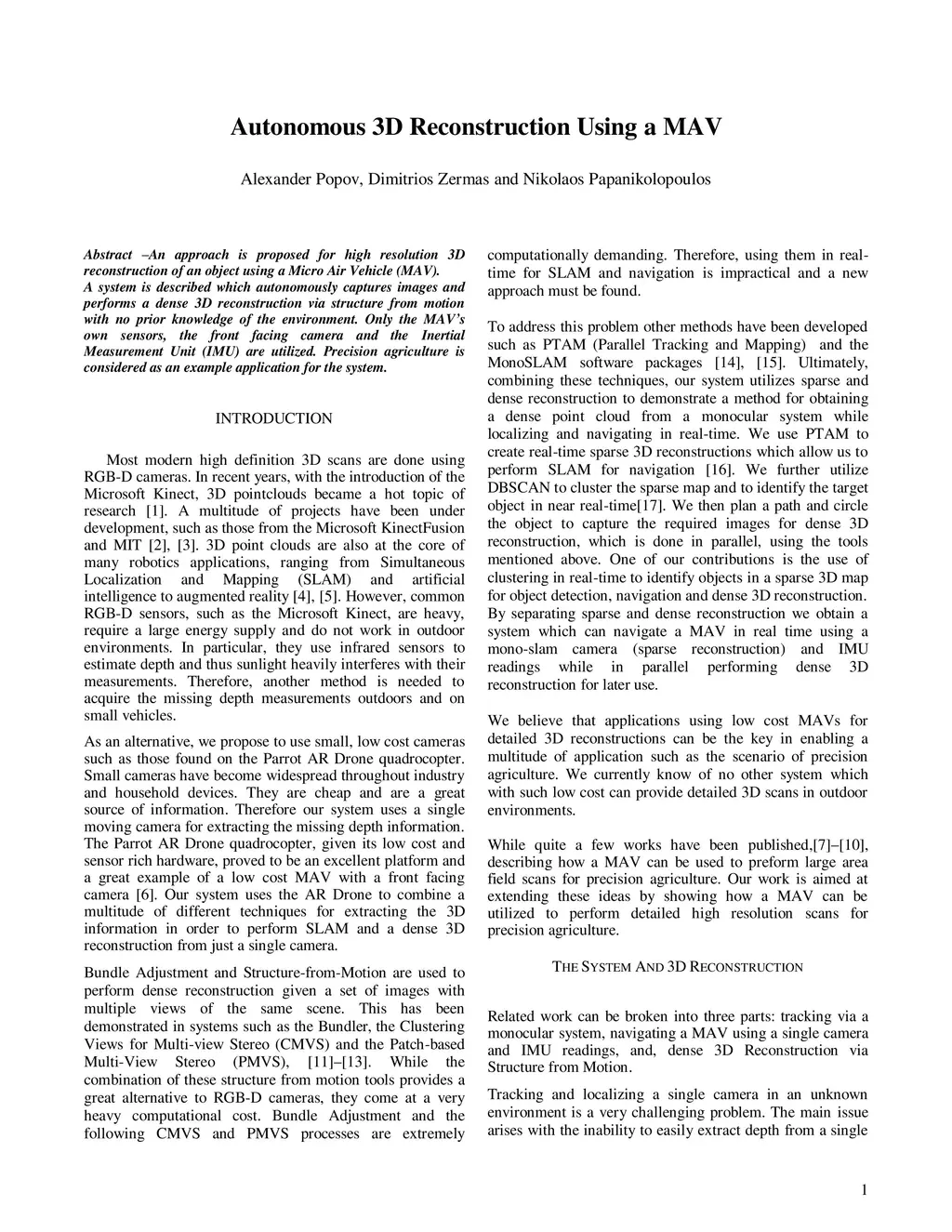 An approach is proposed for high resolution 3D reconstruction of an object using a Micro Air Vehicle (MAV). A system is described which autonomously captures images and performs a dense 3D reconstruction via structure from motion with no prior knowledge of the environment. Only the MAVs own sensors, the front facing camera and the Inertial Measurement Unit (IMU) are utilized. Precision agriculture is considered as an example application for the system.