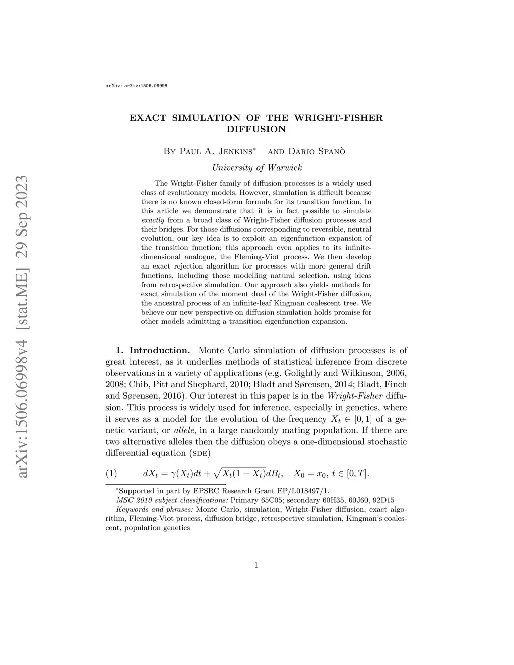 The Wright-Fisher family of diffusion processes is a widely used class of evolutionary models. However, simulation is difficult because there is no known closed-form formula for its transition function. In this article we demonstrate that it is in fact possible to simulate exactly from a broad class of Wright-Fisher diffusion processes and their bridges. For those diffusions corresponding to reversible, neutral evolution, our key idea is to exploit an eigenfunction expansion of the transition function; this approach even applies to its infinite-dimensional analogue, the Fleming-Viot process. We then develop an exact rejection algorithm for processes with more general drift functions, including those modelling natural selection, using ideas from retrospective simulation. Our approach also yields methods for exact simulation of the moment dual of the Wright-Fisher diffusion, the ancestral process of an infinite-leaf Kingman coalescent tree. We believe our new perspective on diffusion simulation holds promise for other models admitting a transition eigenfunction expansion.