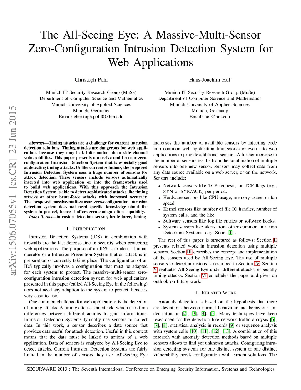 Timing attacks are a challenge for current intrusion detection solutions. Timing attacks are dangerous for web applications because they may leak information about side channel vulnerabilities. This paper presents a massive-multi-sensor zero-configuration Intrusion Detection System that is especially good at detecting timing attacks. Unlike current solutions, the proposed Intrusion Detection System uses a huge number of sensors for attack detection. These sensors include sensors automatically inserted into web application or into the frameworks used to build web applications. With this approach the Intrusion Detection System is able to detect sophisticated attacks like timing attacks or other brute-force attacks with increased accuracy. The proposed massive-multi-sensor zero-configuration intrusion detection system does not need specific knowledge about the system to protect, hence it offers zero-configuration capability.