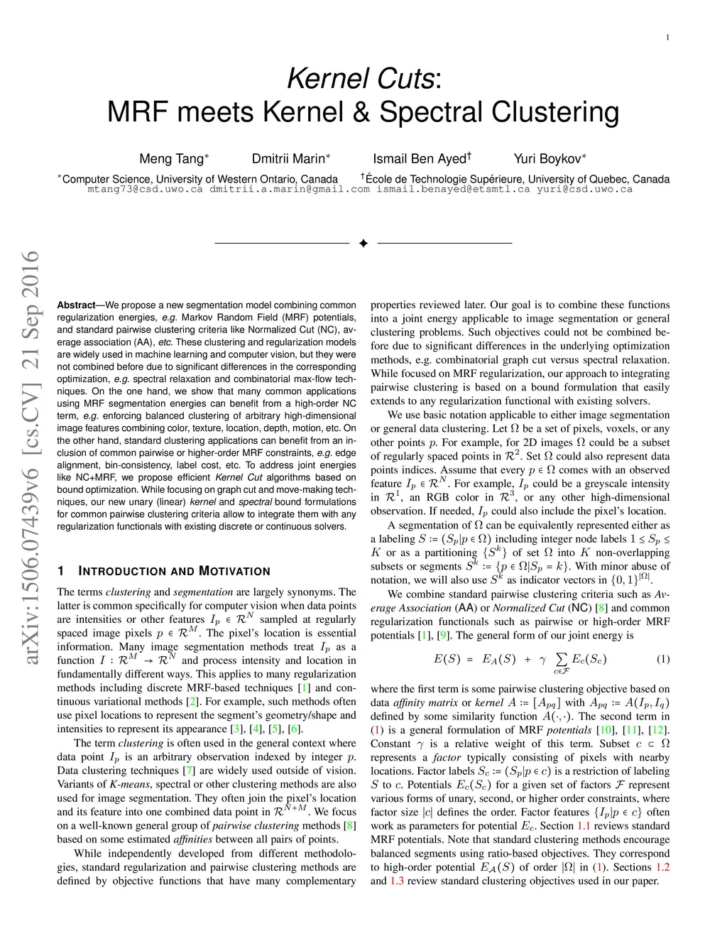Kernel Cuts: MRF meets Kernel & Spectral Clustering