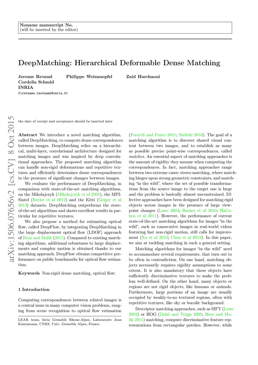 We introduce a novel matching algorithm, called DeepMatching, to compute dense correspondences between images. DeepMatching relies on a hierarchical, multi-layer, correlational architecture designed for matching images and was inspired by deep convolutional approaches. The proposed matching algorithm can handle non-rigid deformations and repetitive textures and efficiently determines dense correspondences in the presence of significant changes between images. We evaluate the performance of DeepMatching, in comparison with state-of-the-art matching algorithms, on the Mikolajczyk (Mikolajczyk et al 2005), the MPI-Sintel (Butler et al 2012) and the Kitti (Geiger et al 2013) datasets. DeepMatching outperforms the state-of-the-art algorithms and shows excellent results in particular for repetitive textures.We also propose a method for estimating optical flow, called DeepFlow, by integrating DeepMatching in the large displacement optical flow (LDOF) approach of Brox and Malik (2011). Compared to existing matching algorithms, additional robustness to large displacements and complex motion is obtained thanks to our matching approach. DeepFlow obtains competitive performance on public benchmarks for optical flow estimation.