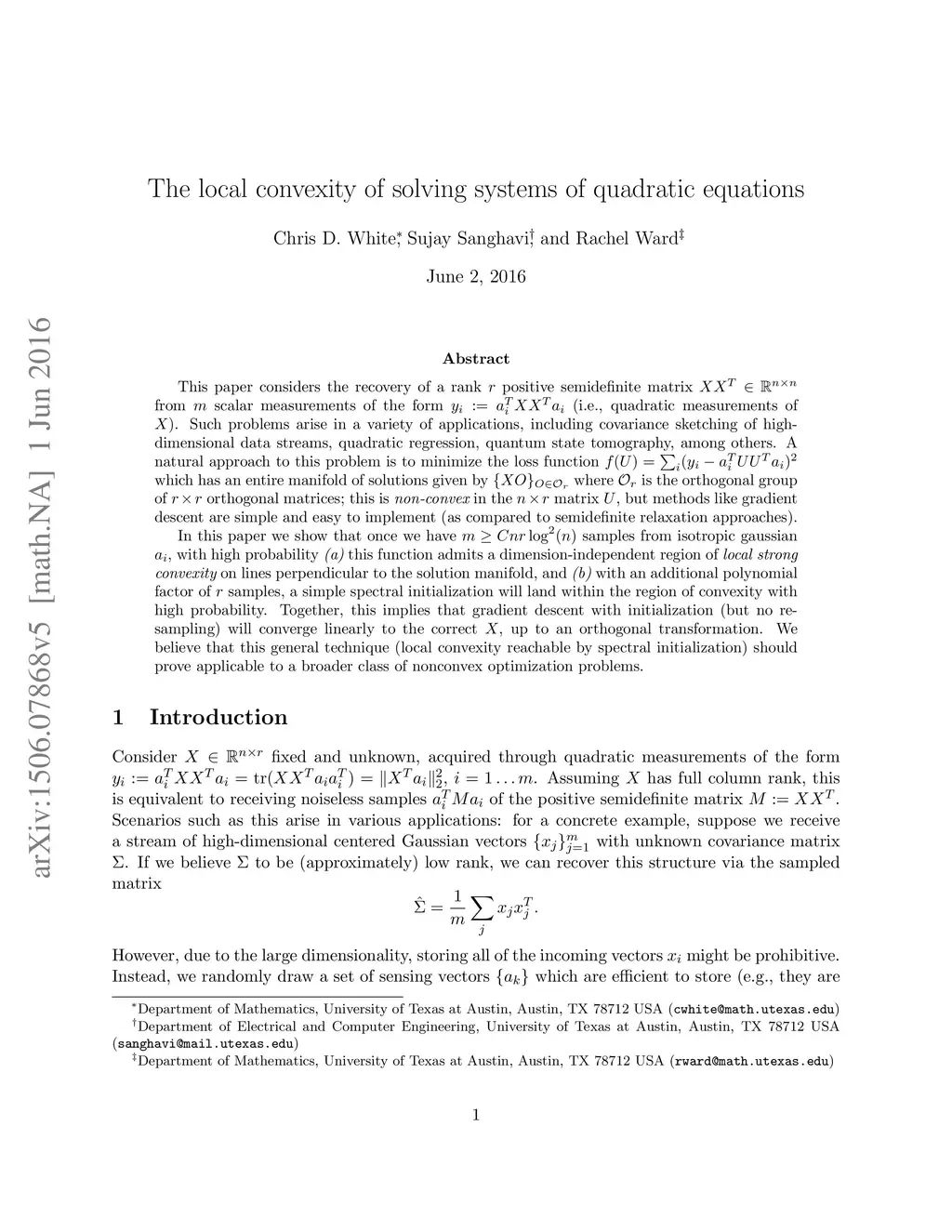 This paper considers the recovery of a rank positive semidefinite matrix from scalar measurements of the form (i.e., quadratic measurements of ). Such problems arise in a variety of applications, including covariance sketching of high-dimensional data streams, quadratic regression, quantum state tomography, among others. A natural approach to this problem is to minimize the loss function which has an entire manifold of solutions given by where is the orthogonal group of orthogonal matrices; this is {\it non-convex} in the matrix , but methods like gradient descent are simple and easy to implement (as compared to semidefinite relaxation approaches). In this paper we show that once we have samples from isotropic gaussian , with high probability {\em (a)} this function admits a dimension-independent region of {\em local strong convexity} on lines perpendicular to the solution manifold, and {\em (b)} with an additional polynomial factor of samples, a simple spectral initialization will land within the region of convexity with high probability. Together, this implies that gradient descent with initialization (but no re-sampling) will converge linearly to the correct , up to an orthogonal transformation. We believe that this general technique (local convexity reachable by spectral initialization) should prove applicable to a broader class of nonconvex optimization problems.
