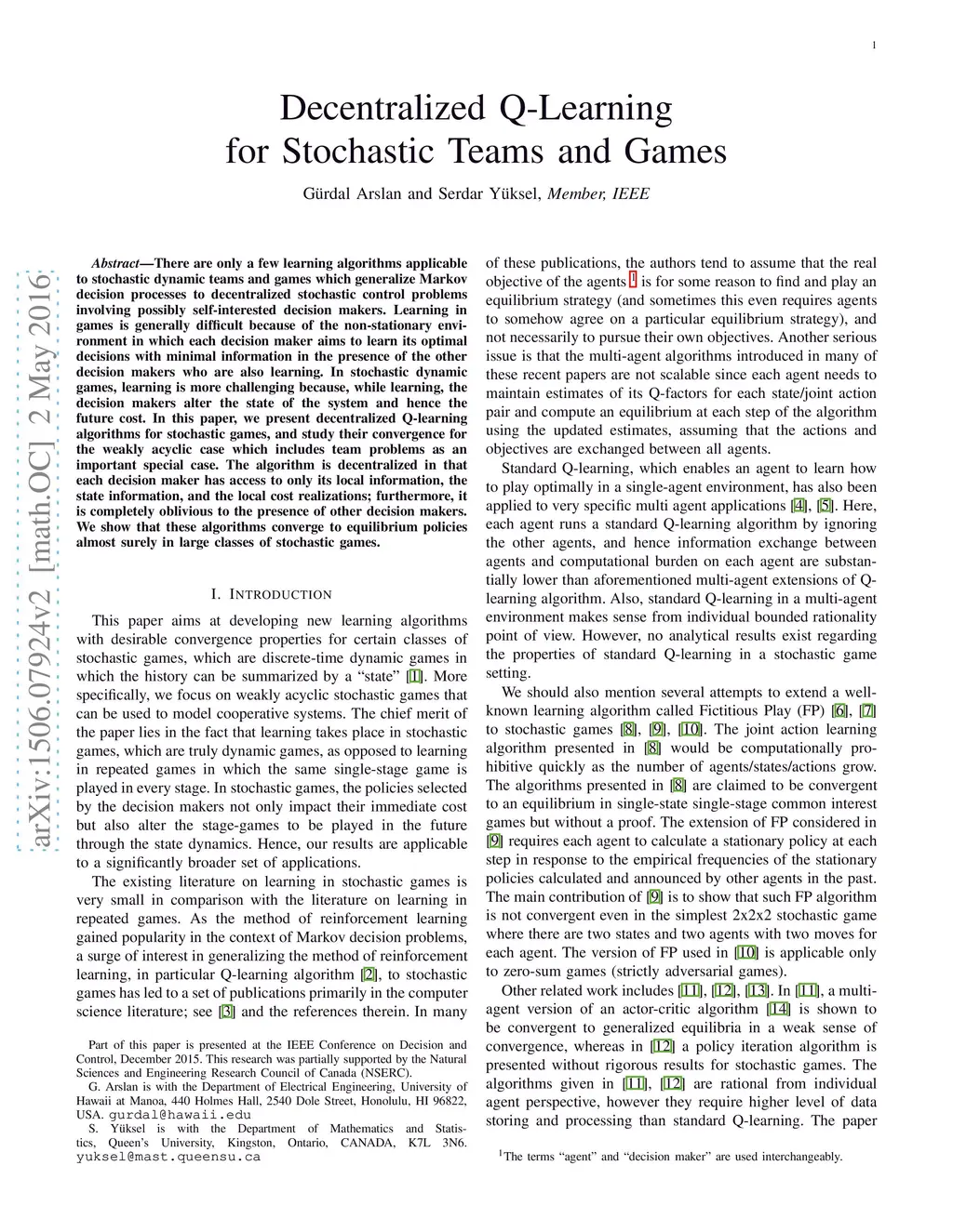 There are only a few learning algorithms applicable to stochastic dynamic teams and games which generalize Markov decision processes to decentralized stochastic control problems involving possibly self-interested decision makers. Learning in games is generally difficult because of the non-stationary environment in which each decision maker aims to learn its optimal decisions with minimal information in the presence of the other decision makers who are also learning. In stochastic dynamic games, learning is more challenging because, while learning, the decision makers alter the state of the system and hence the future cost. In this paper, we present decentralized Q-learning algorithms for stochastic games, and study their convergence for the weakly acyclic case which includes team problems as an important special case. The algorithm is decentralized in that each decision maker has access to only its local information, the state information, and the local cost realizations; furthermore, it is completely oblivious to the presence of other decision makers. We show that these algorithms converge to equilibrium policies almost surely in large classes of stochastic games.