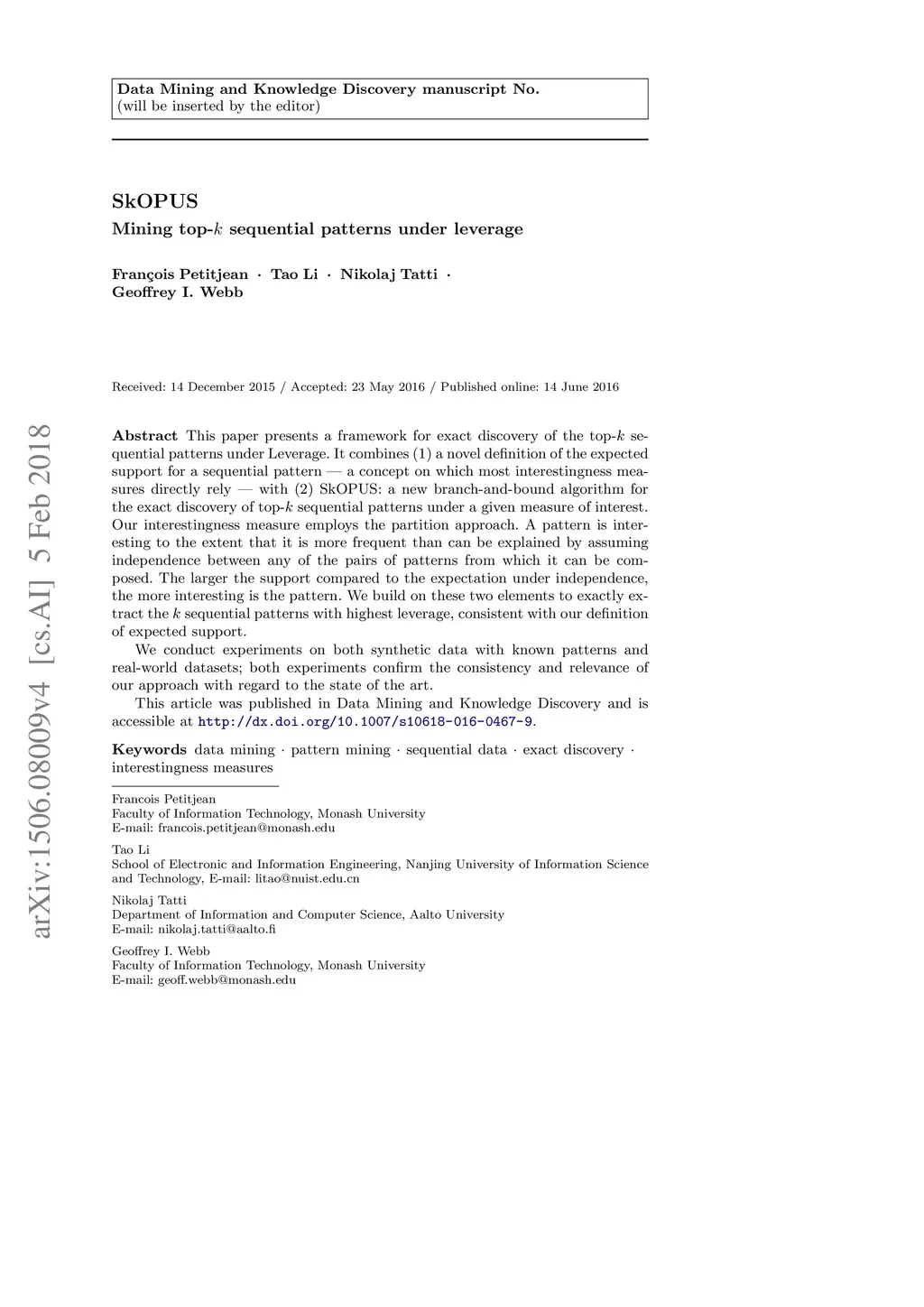 Skopus: Mining top-k sequential patterns under leverage
