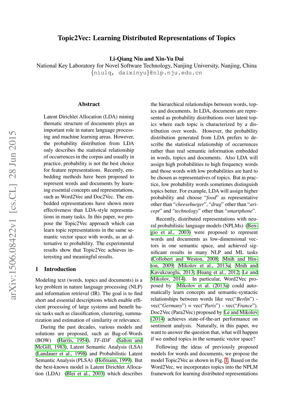 Latent Dirichlet Allocation (LDA) mining thematic structure of documents plays an important role in nature language processing and machine learning areas. However, the probability distribution from LDA only describes the statistical relationship of occurrences in the corpus and usually in practice, probability is not the best choice for feature representations. Recently, embedding methods have been proposed to represent words and documents by learning essential concepts and representations, such as Word2Vec and Doc2Vec. The embedded representations have shown more effectiveness than LDA-style representations in many tasks. In this paper, we propose the Topic2Vec approach which can learn topic representations in the same semantic vector space with words, as an alternative to probability. The experimental results show that Topic2Vec achieves interesting and meaningful results.