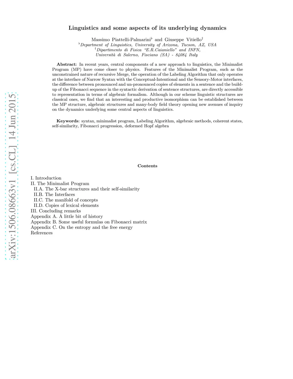 In recent years, central components of a new approach to linguistics, the Minimalist Program (MP) have come closer to physics. Features of the Minimalist Program, such as the unconstrained nature of recursive Merge, the operation of the Labeling Algorithm that only operates at the interface of Narrow Syntax with the Conceptual-Intentional and the Sensory-Motor interfaces, the difference between pronounced and un-pronounced copies of elements in a sentence and the build-up of the Fibonacci sequence in the syntactic derivation of sentence structures, are directly accessible to representation in terms of algebraic formalism. Although in our scheme linguistic structures are classical ones, we find that an interesting and productive isomorphism can be established between the MP structure, algebraic structures and many-body field theory opening new avenues of inquiry on the dynamics underlying some central aspects of linguistics.