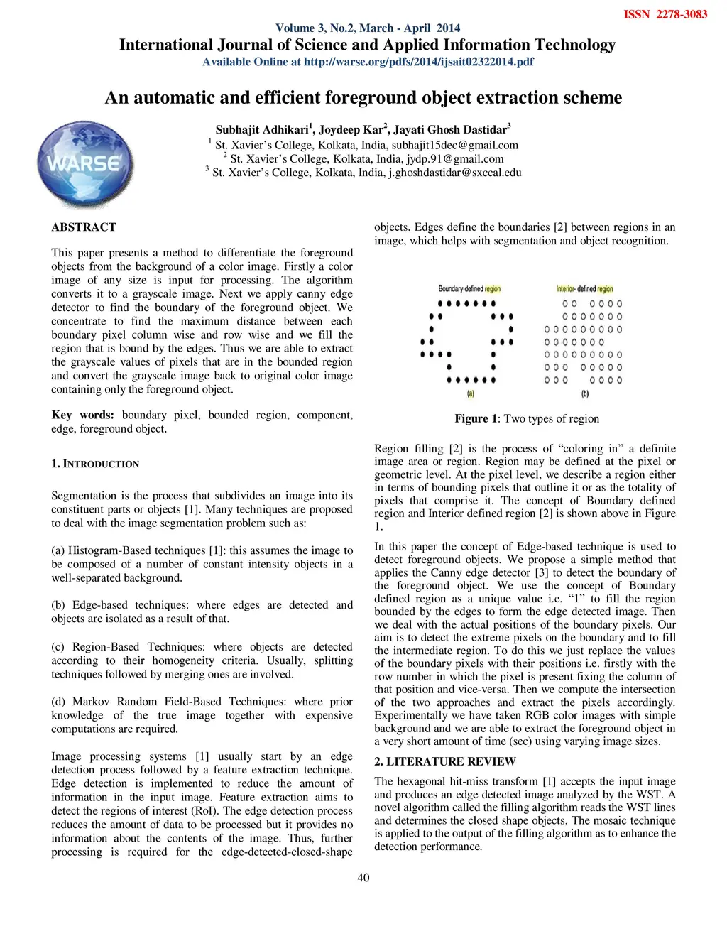 This paper presents a method to differentiate the foreground objects from the background of a color image. Firstly a color image of any size is input for processing. The algorithm converts it to a grayscale image. Next we apply canny edge detector to find the boundary of the foreground object. We concentrate to find the maximum distance between each boundary pixel column wise and row wise and we fill the region that is bound by the edges. Thus we are able to extract the grayscale values of pixels that are in the bounded region and convert the grayscale image back to original color image containing only the foreground object.