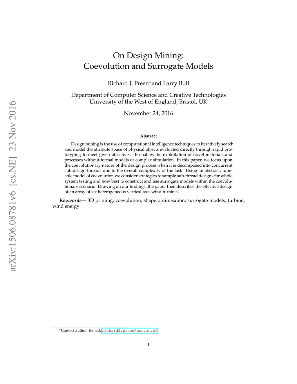 Design mining is the use of computational intelligence techniques to iteratively search and model the attribute space of physical objects evaluated directly through rapid prototyping to meet given objectives. It enables the exploitation of novel materials and processes without formal models or complex simulation. In this paper, we focus upon the coevolutionary nature of the design process when it is decomposed into concurrent sub-design threads due to the overall complexity of the task. Using an abstract, tuneable model of coevolution we consider strategies to sample sub-thread designs for whole system testing and how best to construct and use surrogate models within the coevolutionary scenario. Drawing on our findings, the paper then describes the effective design of an array of six heterogeneous vertical-axis wind turbines.