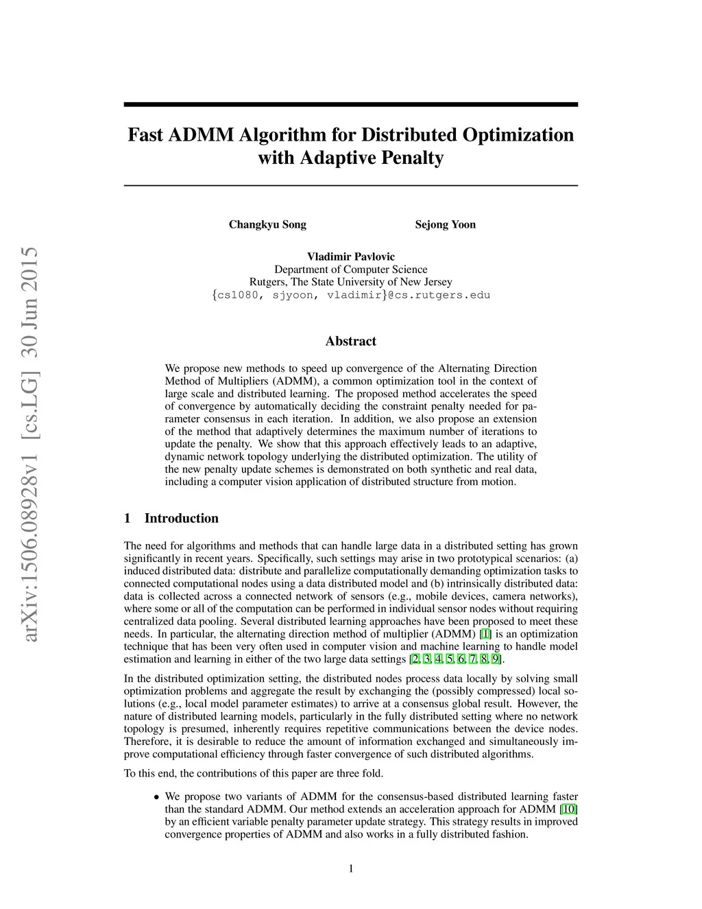 Fast ADMM Algorithm for Distributed Optimization with Adaptive Penalty