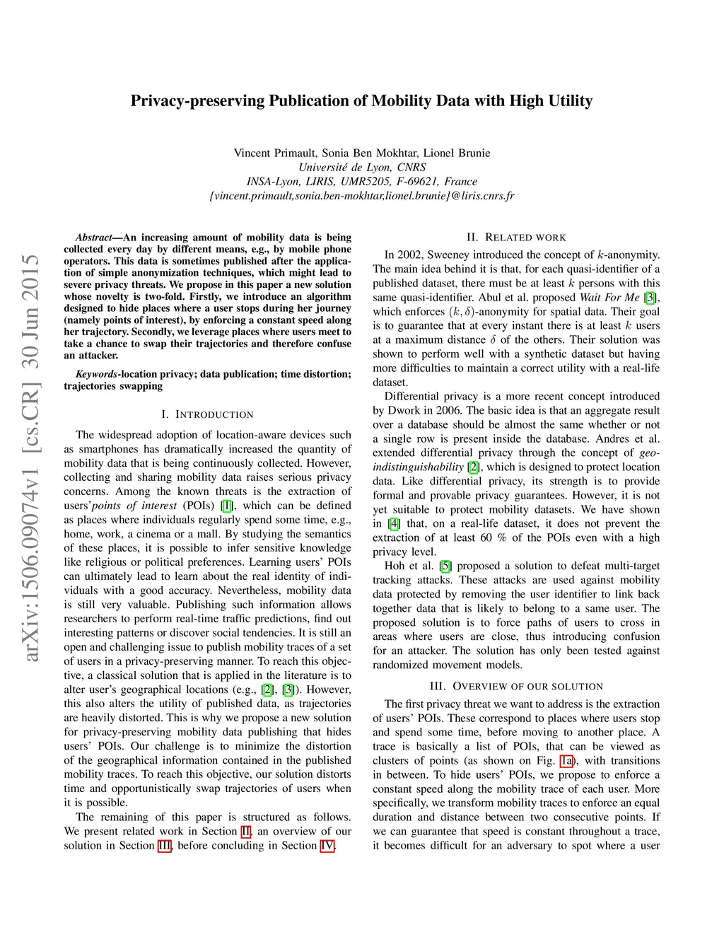 An increasing amount of mobility data is being collected every day by different means, e.g., by mobile phone operators. This data is sometimes published after the application of simple anonymization techniques, which might lead to severe privacy threats. We propose in this paper a new solution whose novelty is twofold. Firstly, we introduce an algorithm designed to hide places where a user stops during her journey (namely points of interest), by enforcing a constant speed along her trajectory. Secondly, we leverage places where users meet to take a chance to swap their trajectories and therefore confuse an attacker.