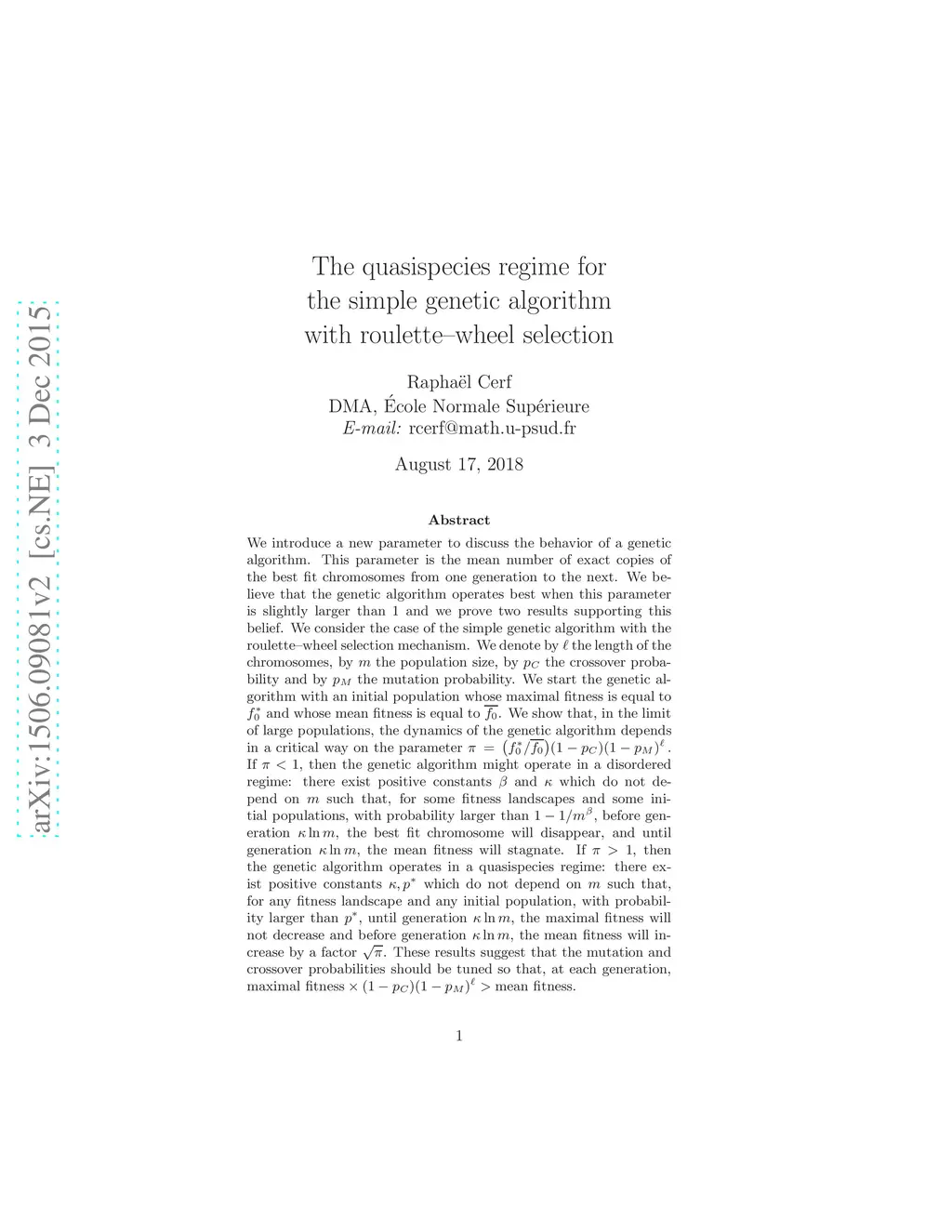 We introduce a new parameter to discuss the behavior of a genetic algorithm. This parameter is the mean number of exact copies of the best fit chromosomes from one generation to the next. We argue that the genetic algorithm should operate efficiently when this parameter is slightly larger than . We consider the case of the simple genetic algorithm with the roulette--wheel selection mechanism. We denote by the length of the chromosomes, by the population size, by the crossover probability and by the mutation probability. We start the genetic algorithm with an initial population whose maximal fitness is equal to and whose mean fitness is equal to . We show that, in the limit of large populations, the dynamics of the genetic algorithm depends in a critical way on the parameter Our results suggest that the mutation and crossover probabilities should be tuned so that, at each generation, .