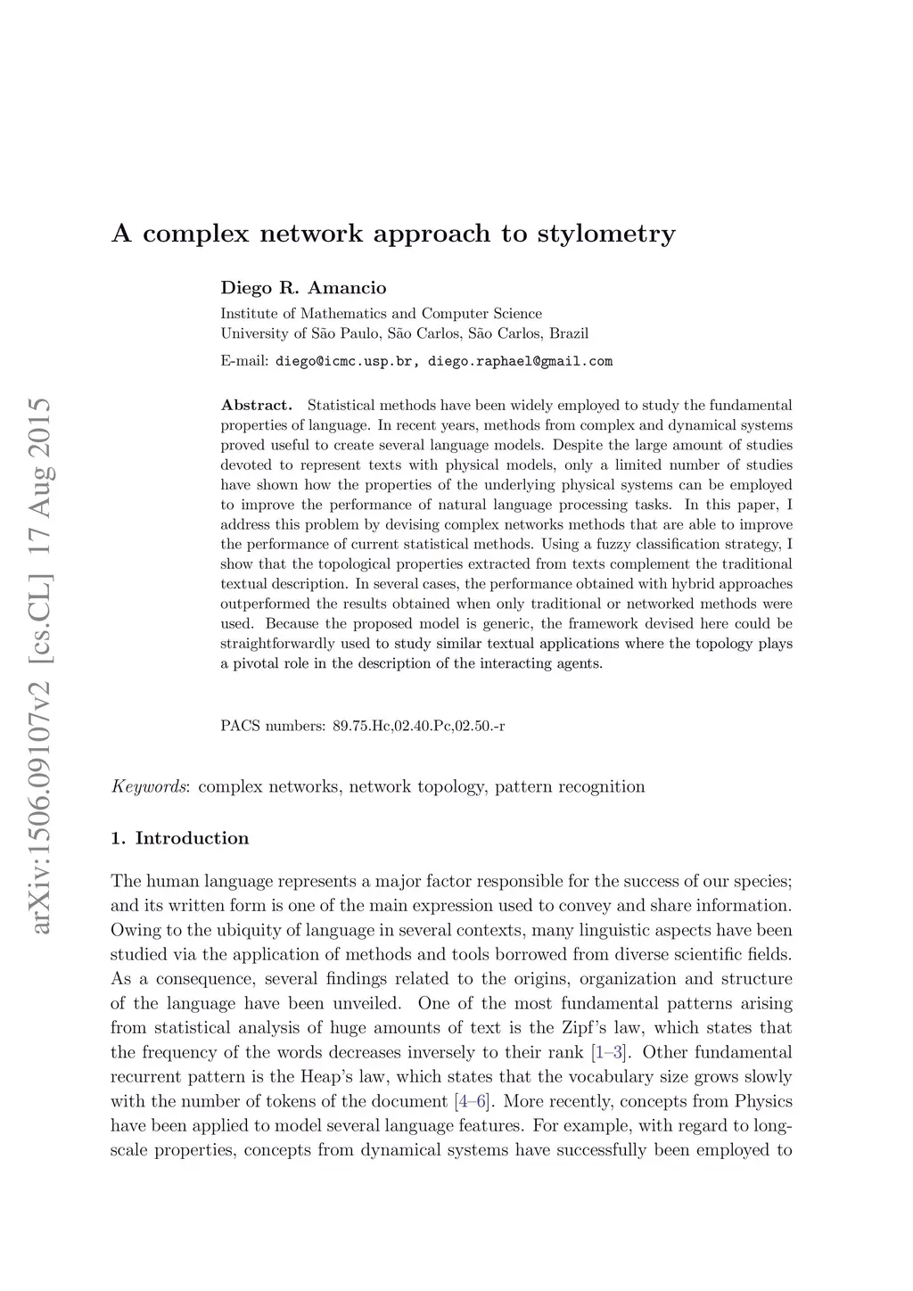Statistical methods have been widely employed to study the fundamental properties of language. In recent years, methods from complex and dynamical systems proved useful to create several language models. Despite the large amount of studies devoted to represent texts with physical models, only a limited number of studies have shown how the properties of the underlying physical systems can be employed to improve the performance of natural language processing tasks. In this paper, I address this problem by devising complex networks methods that are able to improve the performance of current statistical methods. Using a fuzzy classification strategy, I show that the topological properties extracted from texts complement the traditional textual description. In several cases, the performance obtained with hybrid approaches outperformed the results obtained when only traditional or networked methods were used. Because the proposed model is generic, the framework devised here could be straightforwardly used to study similar textual applications where the topology plays a pivotal role in the description of the interacting agents.