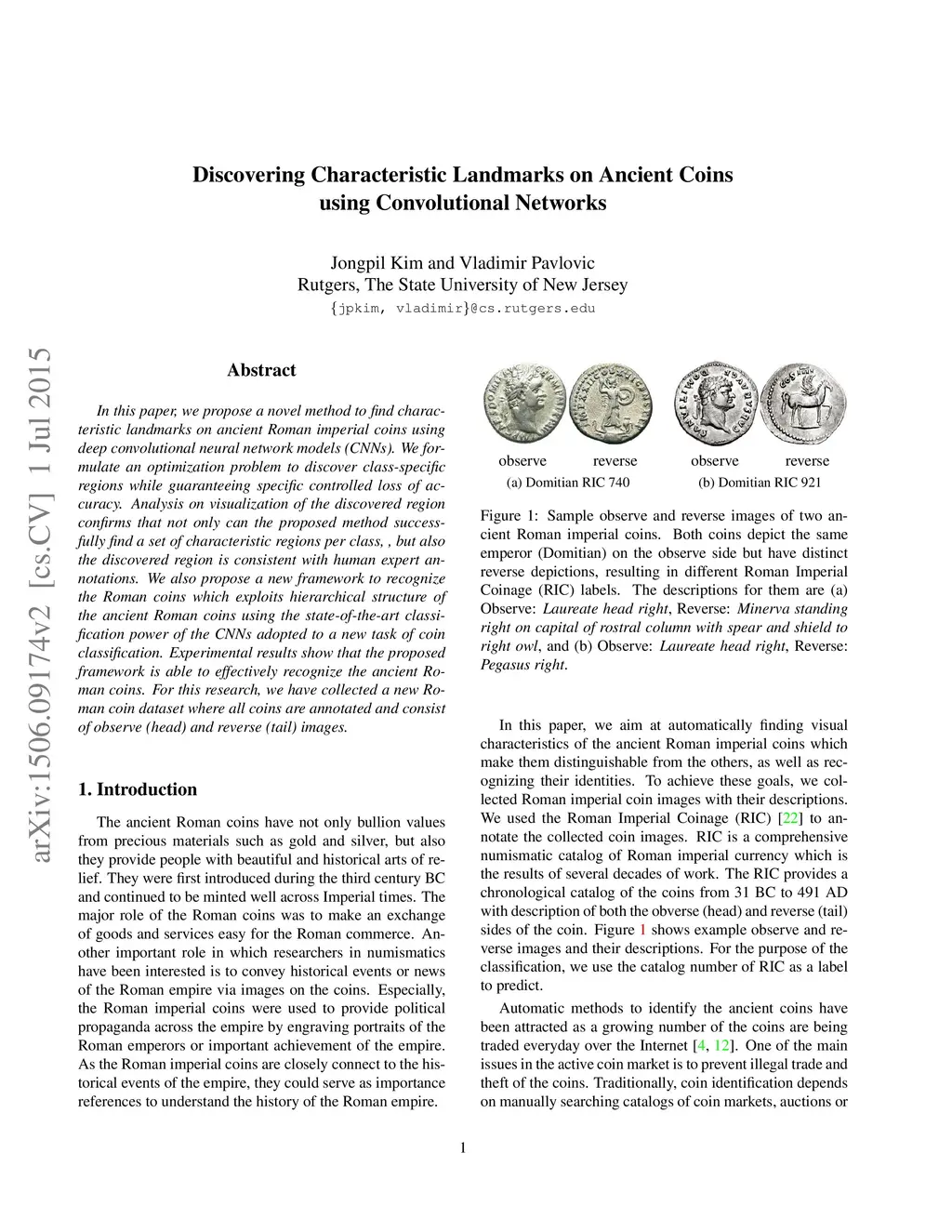In this paper, we propose a novel method to find characteristic landmarks on ancient Roman imperial coins using deep convolutional neural network models (CNNs). We formulate an optimization problem to discover class-specific regions while guaranteeing specific controlled loss of accuracy. Analysis on visualization of the discovered region confirms that not only can the proposed method successfully find a set of characteristic regions per class, but also the discovered region is consistent with human expert annotations. We also propose a new framework to recognize the Roman coins which exploits hierarchical structure of the ancient Roman coins using the state-of-the-art classification power of the CNNs adopted to a new task of coin classification. Experimental results show that the proposed framework is able to effectively recognize the ancient Roman coins. For this research, we have collected a new Roman coin dataset where all coins are annotated and consist of observe (head) and reverse (tail) images.