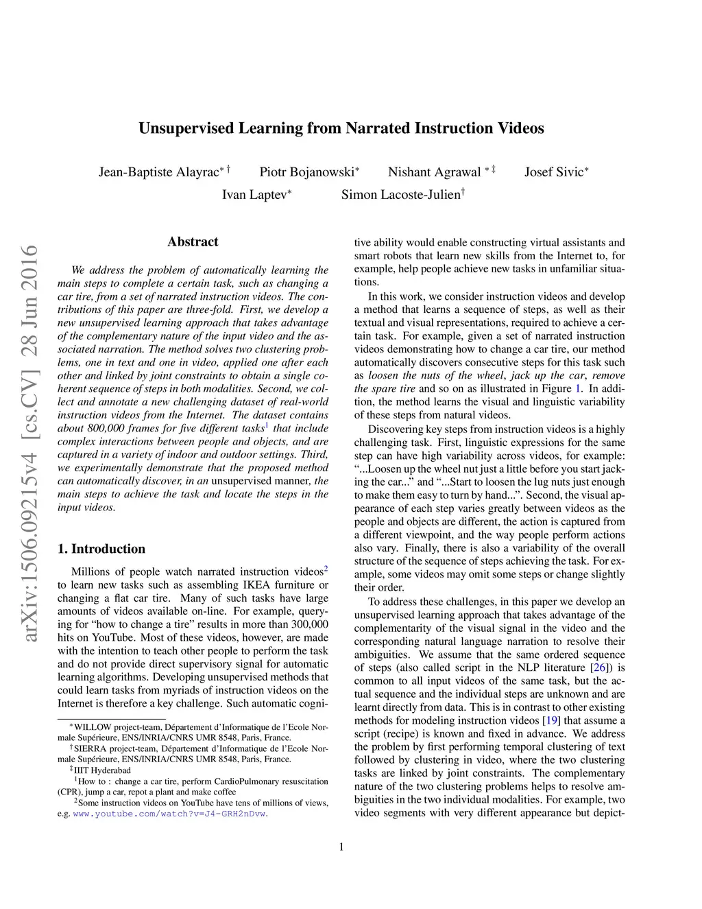 We address the problem of automatically learning the main steps to complete a certain task, such as changing a car tire, from a set of narrated instruction videos. The contributions of this paper are three-fold. First, we develop a new unsupervised learning approach that takes advantage of the complementary nature of the input video and the associated narration. The method solves two clustering problems, one in text and one in video, applied one after each other and linked by joint constraints to obtain a single coherent sequence of steps in both modalities. Second, we collect and annotate a new challenging dataset of real-world instruction videos from the Internet. The dataset contains about 800,000 frames for five different tasks that include complex interactions between people and objects, and are captured in a variety of indoor and outdoor settings. Third, we experimentally demonstrate that the proposed method can automatically discover, in an unsupervised manner, the main steps to achieve the task and locate the steps in the input videos.