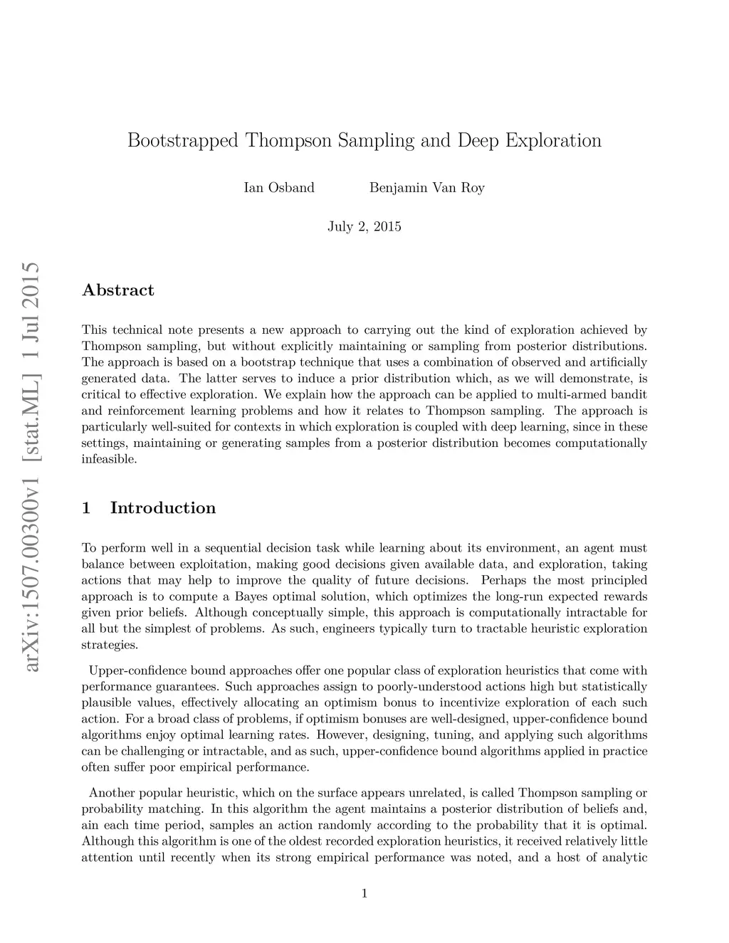 This technical note presents a new approach to carrying out the kind of exploration achieved by Thompson sampling, but without explicitly maintaining or sampling from posterior distributions. The approach is based on a bootstrap technique that uses a combination of observed and artificially generated data. The latter serves to induce a prior distribution which, as we will demonstrate, is critical to effective exploration. We explain how the approach can be applied to multi-armed bandit and reinforcement learning problems and how it relates to Thompson sampling. The approach is particularly well-suited for contexts in which exploration is coupled with deep learning, since in these settings, maintaining or generating samples from a posterior distribution becomes computationally infeasible.