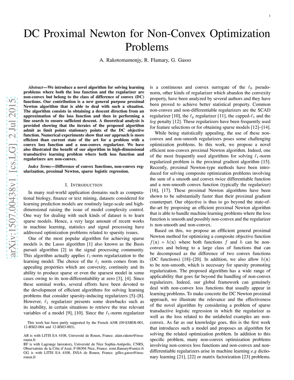 We introduce a novel algorithm for solving learning problems where both the loss function and the regularizer are non-convex but belong to the class of difference of convex (DC) functions. Our contribution is a new general purpose proximal Newton algorithm that is able to deal with such a situation. The algorithm consists in obtaining a descent direction from an approximation of the loss function and then in performing a line search to ensure sufficient descent. A theoretical analysis is provided showing that the iterates of the proposed algorithm {admit} as limit points stationary points of the DC objective function. Numerical experiments show that our approach is more efficient than current state of the art for a problem with a convex loss functions and non-convex regularizer. We have also illustrated the benefit of our algorithm in high-dimensional transductive learning problem where both loss function and regularizers are non-convex.