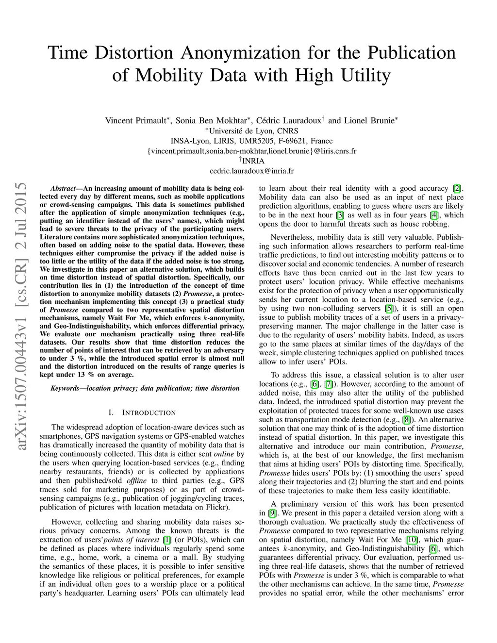 An increasing amount of mobility data is being collected every day by different means, such as mobile applications or crowd-sensing campaigns. This data is sometimes published after the application of simple anonymization techniques (e.g., putting an identifier instead of the users' names), which might lead to severe threats to the privacy of the participating users. Literature contains more sophisticated anonymization techniques, often based on adding noise to the spatial data. However, these techniques either compromise the privacy if the added noise is too little or the utility of the data if the added noise is too strong. We investigate in this paper an alternative solution, which builds on time distortion instead of spatial distortion. Specifically, our contribution lies in (1) the introduction of the concept of time distortion to anonymize mobility datasets (2) Promesse, a protection mechanism implementing this concept (3) a practical study of Promesse compared to two representative spatial distortion mechanisms, namely Wait For Me, which enforces k-anonymity, and Geo-Indistinguishability, which enforces differential privacy. We evaluate our mechanism practically using three real-life datasets. Our results show that time distortion reduces the number of points of interest that can be retrieved by an adversary to under 3 %, while the introduced spatial error is almost null and the distortion introduced on the results of range queries is kept under 13 % on average.