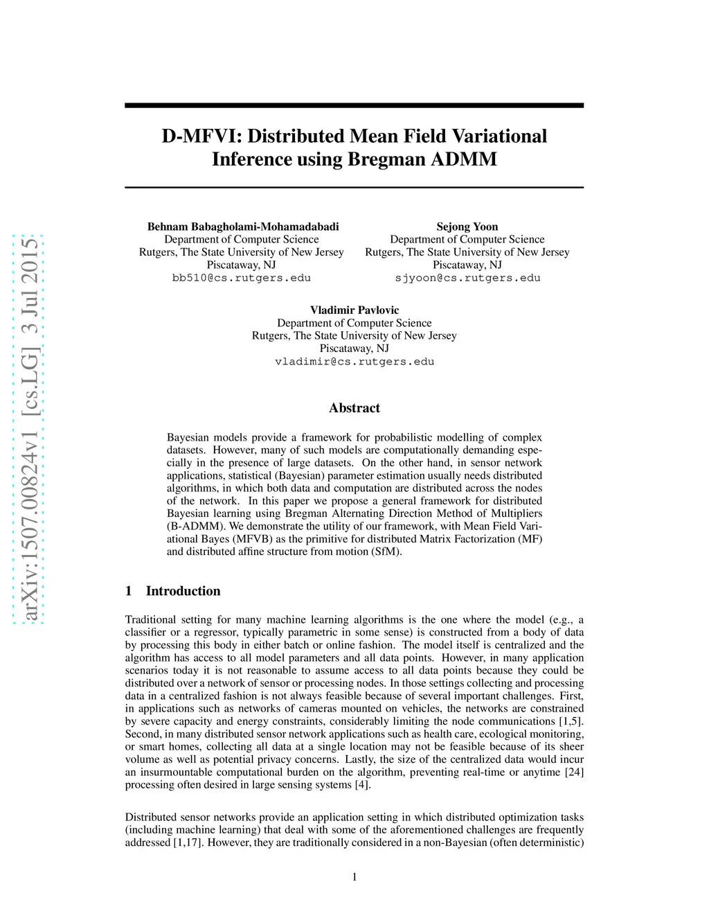 Bayesian models provide a framework for probabilistic modelling of complex datasets. However, many of such models are computationally demanding especially in the presence of large datasets. On the other hand, in sensor network applications, statistical (Bayesian) parameter estimation usually needs distributed algorithms, in which both data and computation are distributed across the nodes of the network. In this paper we propose a general framework for distributed Bayesian learning using Bregman Alternating Direction Method of Multipliers (B-ADMM). We demonstrate the utility of our framework, with Mean Field Variational Bayes (MFVB) as the primitive for distributed Matrix Factorization (MF) and distributed affine structure from motion (SfM).
