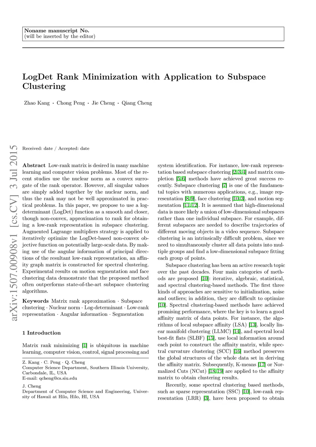 LogDet Rank Minimization with Application to Subspace Clustering