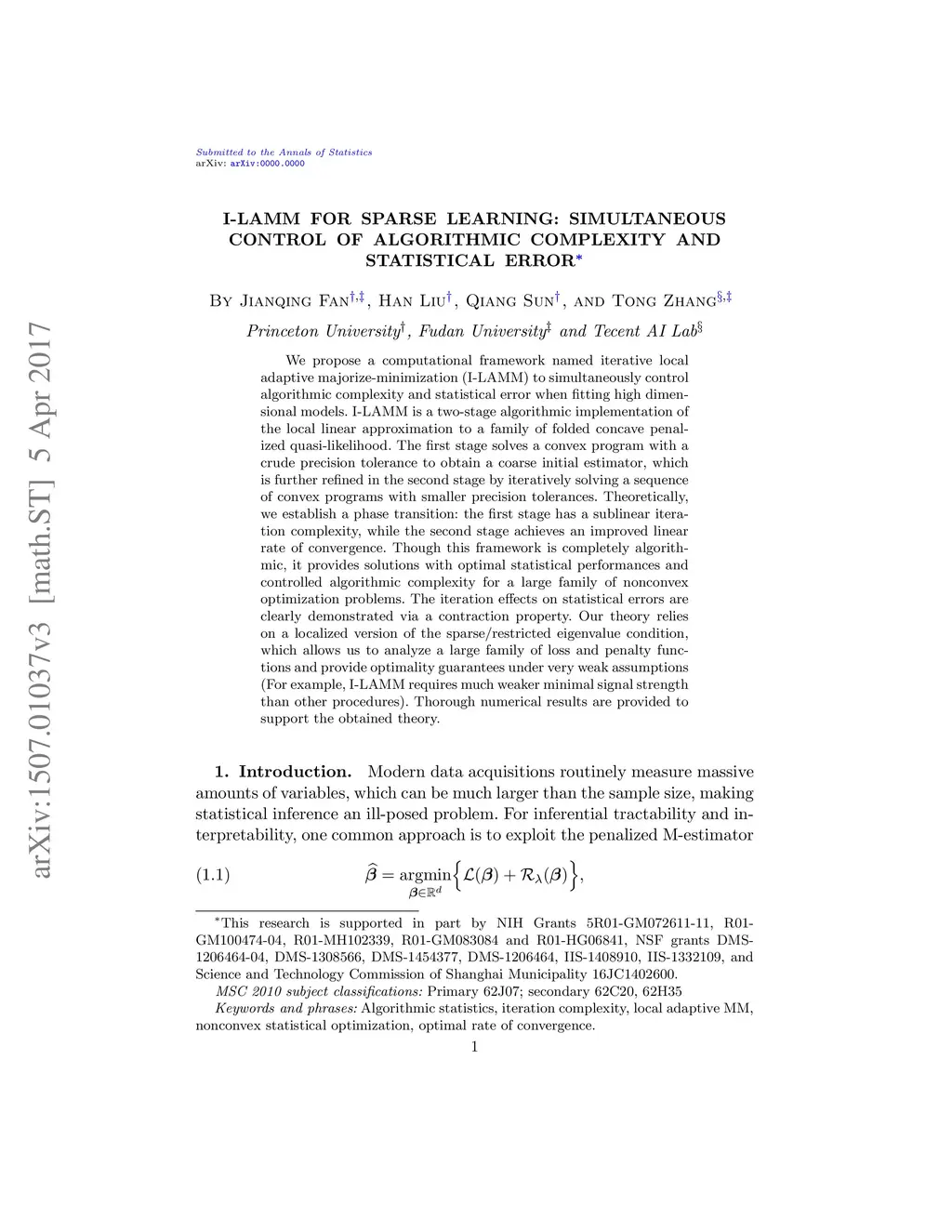 We propose a computational framework named iterative local adaptive majorize-minimization (I-LAMM) to simultaneously control algorithmic complexity and statistical error when fitting high dimensional models. I-LAMM is a two-stage algorithmic implementation of the local linear approximation to a family of folded concave penalized quasi-likelihood. The first stage solves a convex program with a crude precision tolerance to obtain a coarse initial estimator, which is further refined in the second stage by iteratively solving a sequence of convex programs with smaller precision tolerances. Theoretically, we establish a phase transition: the first stage has a sublinear iteration complexity, while the second stage achieves an improved linear rate of convergence. Though this framework is completely algorithmic, it provides solutions with optimal statistical performances and controlled algorithmic complexity for a large family of nonconvex optimization problems. The iteration effects on statistical errors are clearly demonstrated via a contraction property. Our theory relies on a localized version of the sparse/restricted eigenvalue condition, which allows us to analyze a large family of loss and penalty functions and provide optimality guarantees under very weak assumptions (For example, I-LAMM requires much weaker minimal signal strength than other procedures). Thorough numerical results are provided to support the obtained theory.