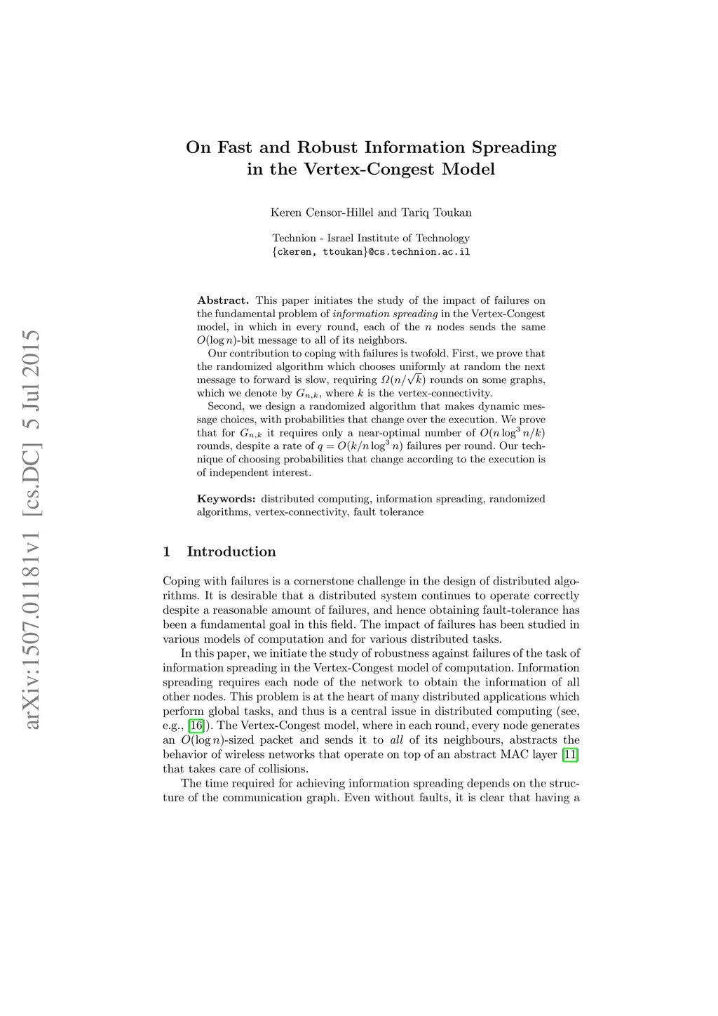 This paper initiates the study of the impact of failures on the fundamental problem of \emph{information spreading} in the Vertex-Congest model, in which in every round, each of the nodes sends the same -bit message to all of its neighbors. Our contribution to coping with failures is twofold. First, we prove that the randomized algorithm which chooses uniformly at random the next message to forward is slow, requiring rounds on some graphs, which we denote by , where is the vertex-connectivity. Second, we design a randomized algorithm that makes dynamic message choices, with probabilities that change over the execution. We prove that for it requires only a near-optimal number of rounds, despite a rate of failures per round. Our technique of choosing probabilities that change according to the execution is of independent interest.