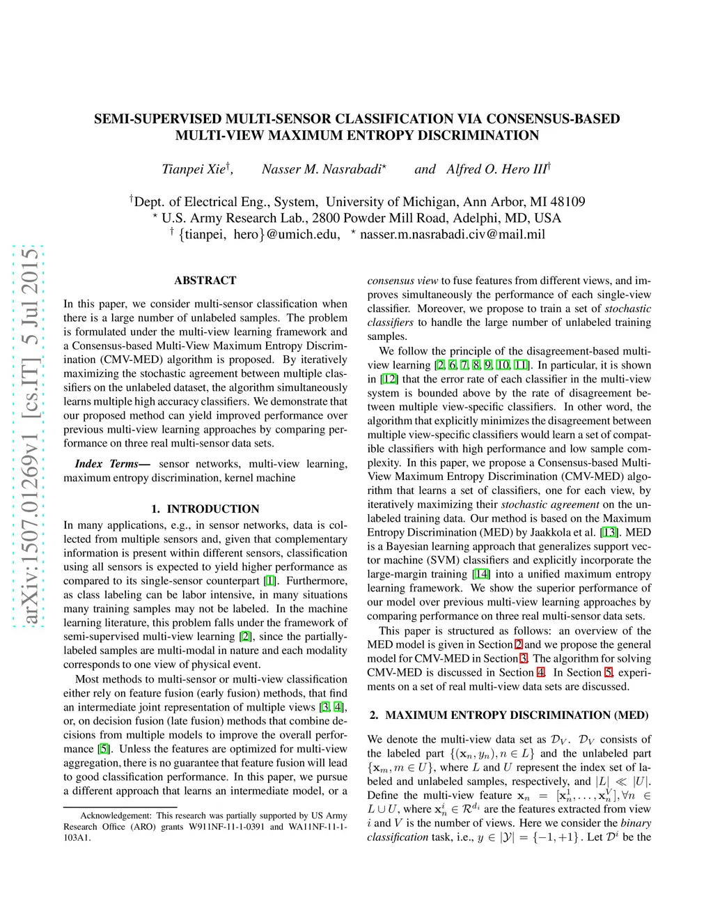 In this paper, we consider multi-sensor classification when there is a large number of unlabeled samples. The problem is formulated under the multi-view learning framework and a Consensus-based Multi-View Maximum Entropy Discrimination (CMV-MED) algorithm is proposed. By iteratively maximizing the stochastic agreement between multiple classifiers on the unlabeled dataset, the algorithm simultaneously learns multiple high accuracy classifiers. We demonstrate that our proposed method can yield improved performance over previous multi-view learning approaches by comparing performance on three real multi-sensor data sets.
