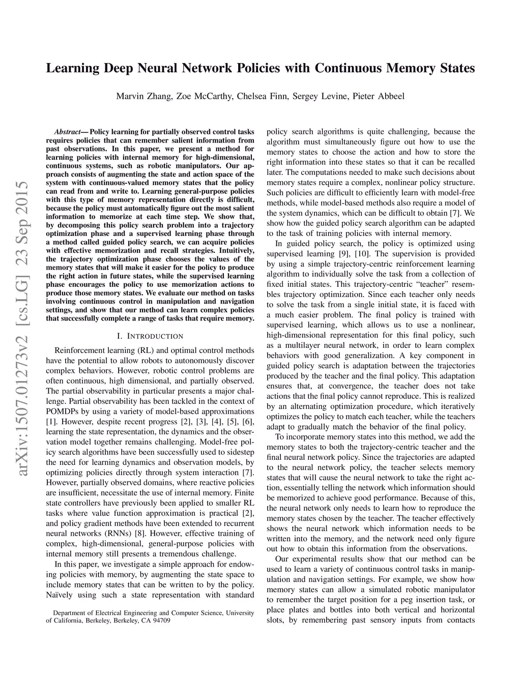 Learning Deep Neural Network Policies with Continuous Memory States