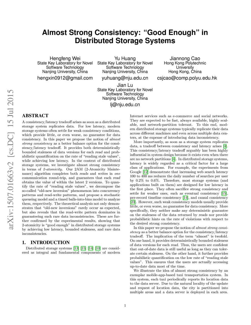 A consistency/latency tradeoff arises as soon as a distributed storage system replicates data. For low latency, modern storage systems often settle for weak consistency conditions, which provide little, or even worse, no guarantee for data consistency. In this paper we propose the notion of almost strong consistency as a better balance option for the consistency/latency tradeoff. It provides both deterministically bounded staleness of data versions for each read and probabilistic quantification on the rate of "reading stale values", while achieving low latency. In the context of distributed storage systems, we investigate almost strong consistency in terms of 2-atomicity. Our 2AM (2-Atomicity Maintenance) algorithm completes both reads and writes in one communication round-trip, and guarantees that each read obtains the value of within the latest 2 versions. To quantify the rate of "reading stale values", we decompose the so-called "old-new inversion" phenomenon into concurrency patterns and read-write patterns, and propose a stochastic queueing model and a "timed balls-into-bins model" to analyze them, respectively. The theoretical analysis not only demonstrates that "old-new inversions" rarely occur as expected, but also reveals that the read-write pattern dominates in guaranteeing such rare data inconsistencies. These are further confirmed by the experimental results, showing that 2-atomicity is "good enough" in distributed storage systems by achieving low latency, bounded staleness, and rare data inconsistencies.