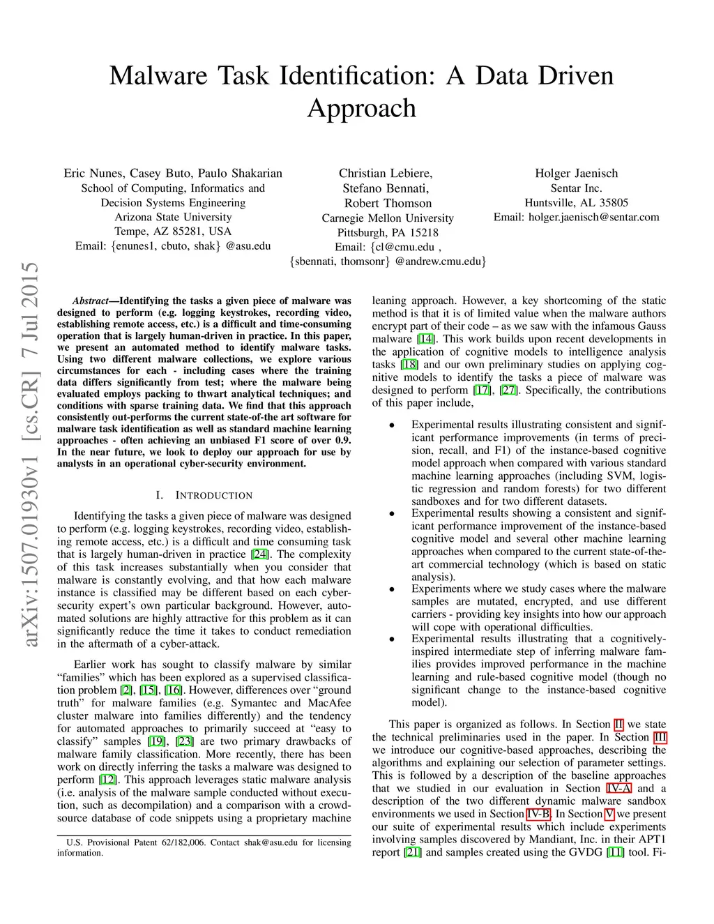 Identifying the tasks a given piece of malware was designed to perform (e.g. logging keystrokes, recording video, establishing remote access, etc.) is a difficult and time-consuming operation that is largely human-driven in practice. In this paper, we present an automated method to identify malware tasks. Using two different malware collections, we explore various circumstances for each - including cases where the training data differs significantly from test; where the malware being evaluated employs packing to thwart analytical techniques; and conditions with sparse training data. We find that this approach consistently out-performs the current state-of-the art software for malware task identification as well as standard machine learning approaches - often achieving an unbiased F1 score of over 0.9. In the near future, we look to deploy our approach for use by analysts in an operational cyber-security environment.