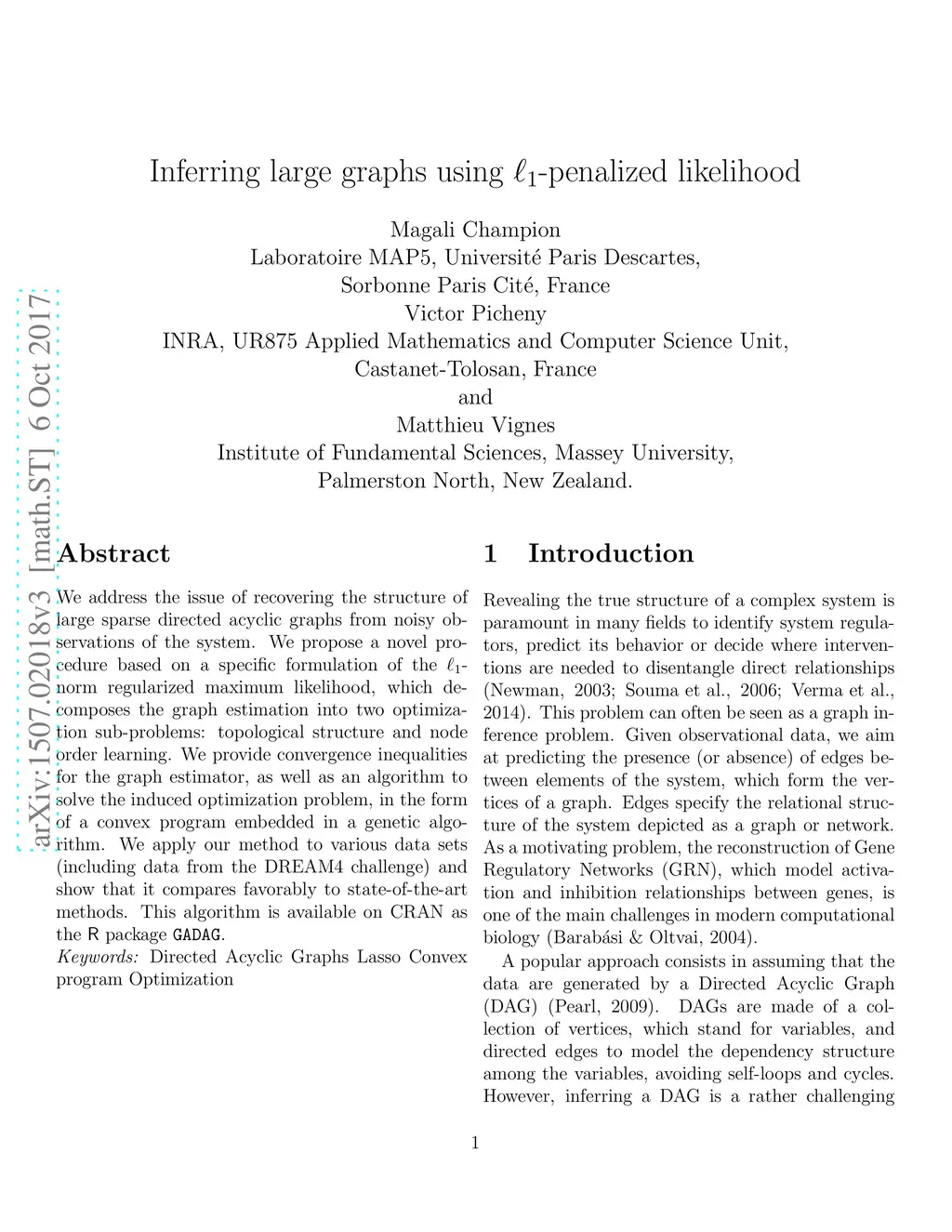 We address the issue of recovering the structure of large sparse directed acyclic graphs from noisy observations of the system. We propose a novel procedure based on a specific formulation of the l1-norm regularized maximum likelihood, which decomposes the graph estimation into two optimization sub-problems: topological structure and node order learning. We provide oracle inequalities for the graph estimator, as well as an algorithm to solve the induced optimization problem, in the form of a convex program embedded in a genetic algorithm. We apply our method to various data sets (including data from the DREAM4 challenge) and show that it compares favorably to state-of-the-art methods.